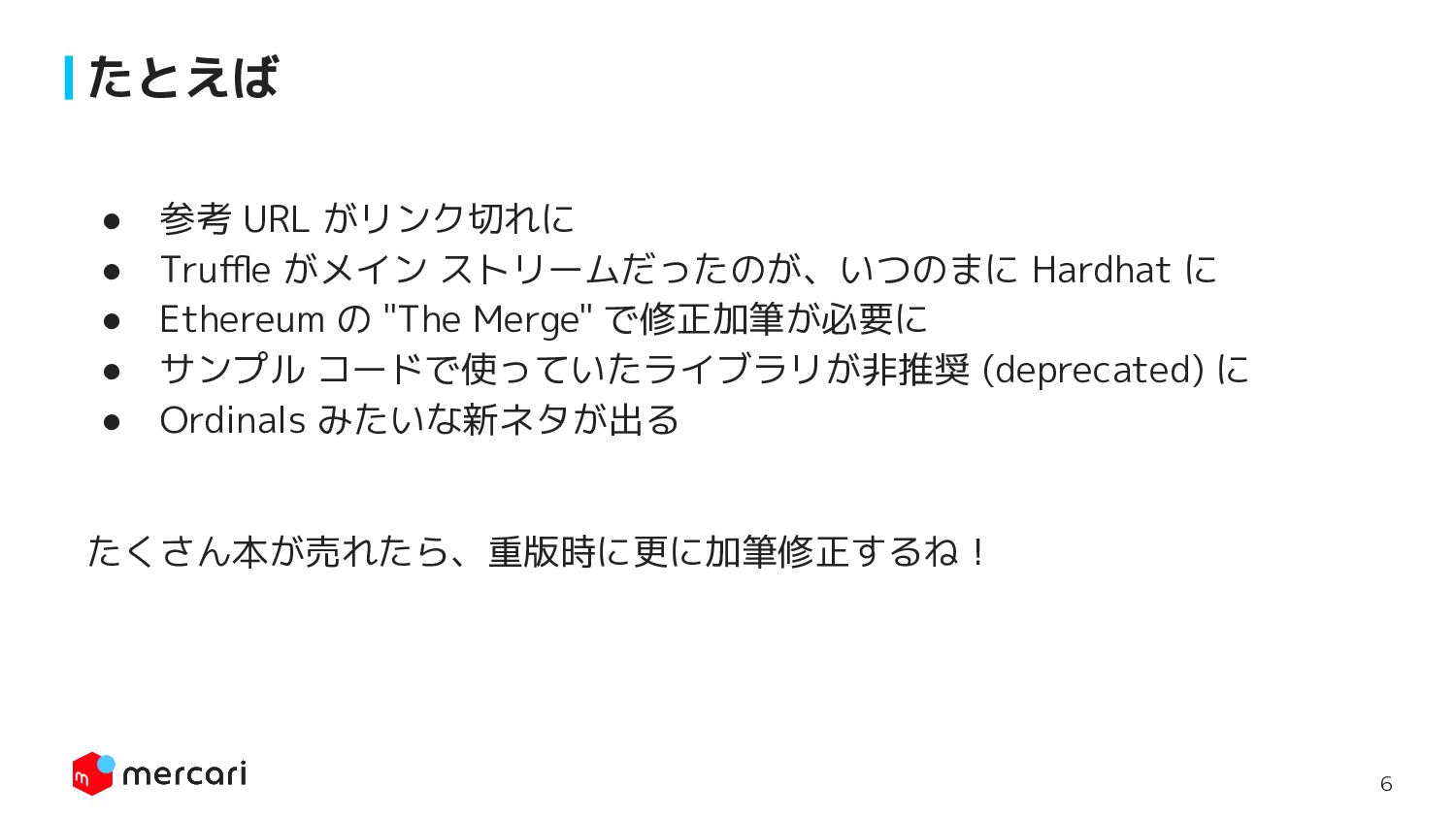 に • Ethereum の "The Merge" で修正加筆が必要に • サンプル コードで使っていたライブラリが非推奨 (deprecated) に • Ordinals みたいな新ネタが出る たくさん本が売れたら、重版時に更に加筆修正するね! たとえば