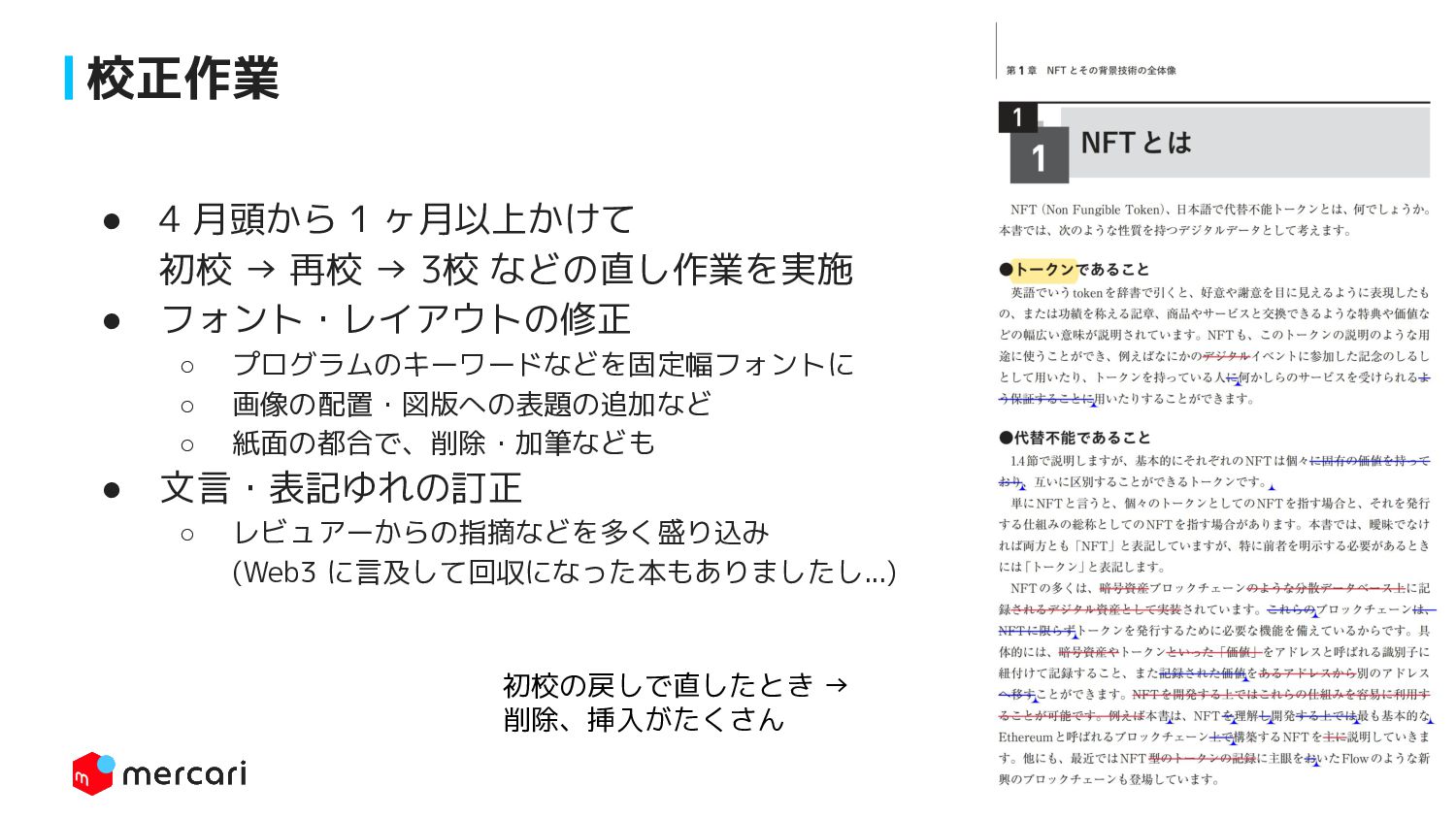 3校 などの直し作業を実施 • フォント・レイアウトの修正 ◦ プログラムのキーワードなどを固定幅フォントに ◦ 画像の配置・図版への表題の追加など ◦ 紙面の都合で、削除・加筆なども • 文言・表記ゆれの訂正 ◦ レビュアーからの指摘などを多く盛り込み (Web3 に言及して回収になった本もありましたし...) 校正作業 初校の戻しで直したとき → 削除、挿入がたくさん