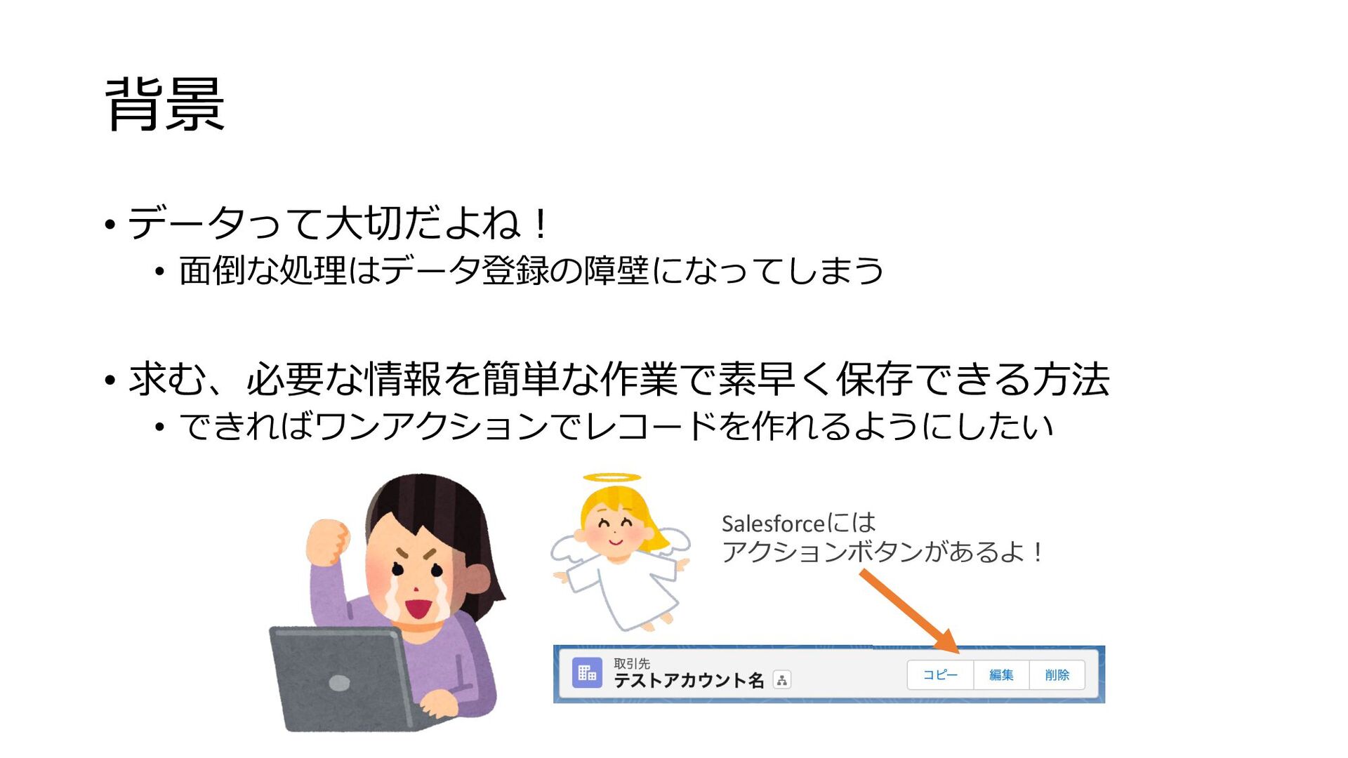 背景 • データって⼤切だよね︕ • ⾯倒な処理はデータ登録の障壁になってしまう • 求む、必要な情報を簡単な作業で素早く保存できる⽅法 • できればワンアクションでレコードを作れるようにしたい Salesforceには