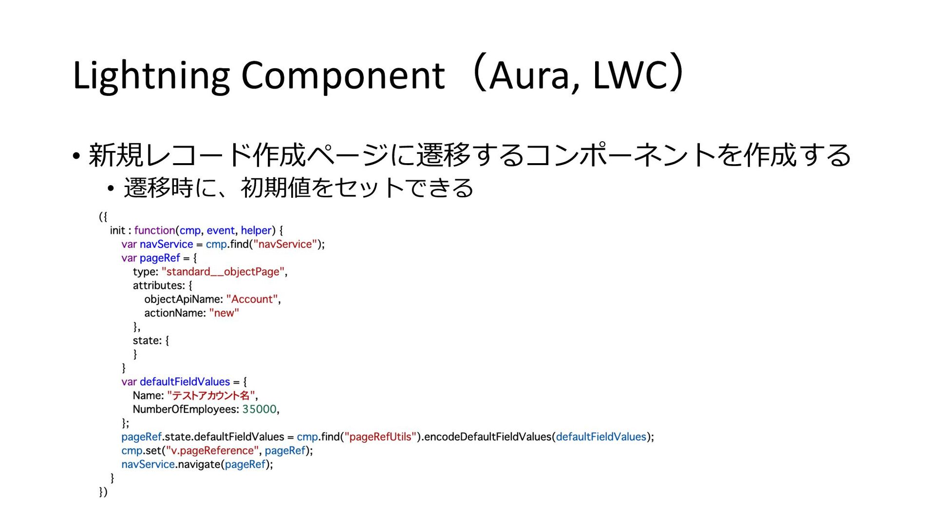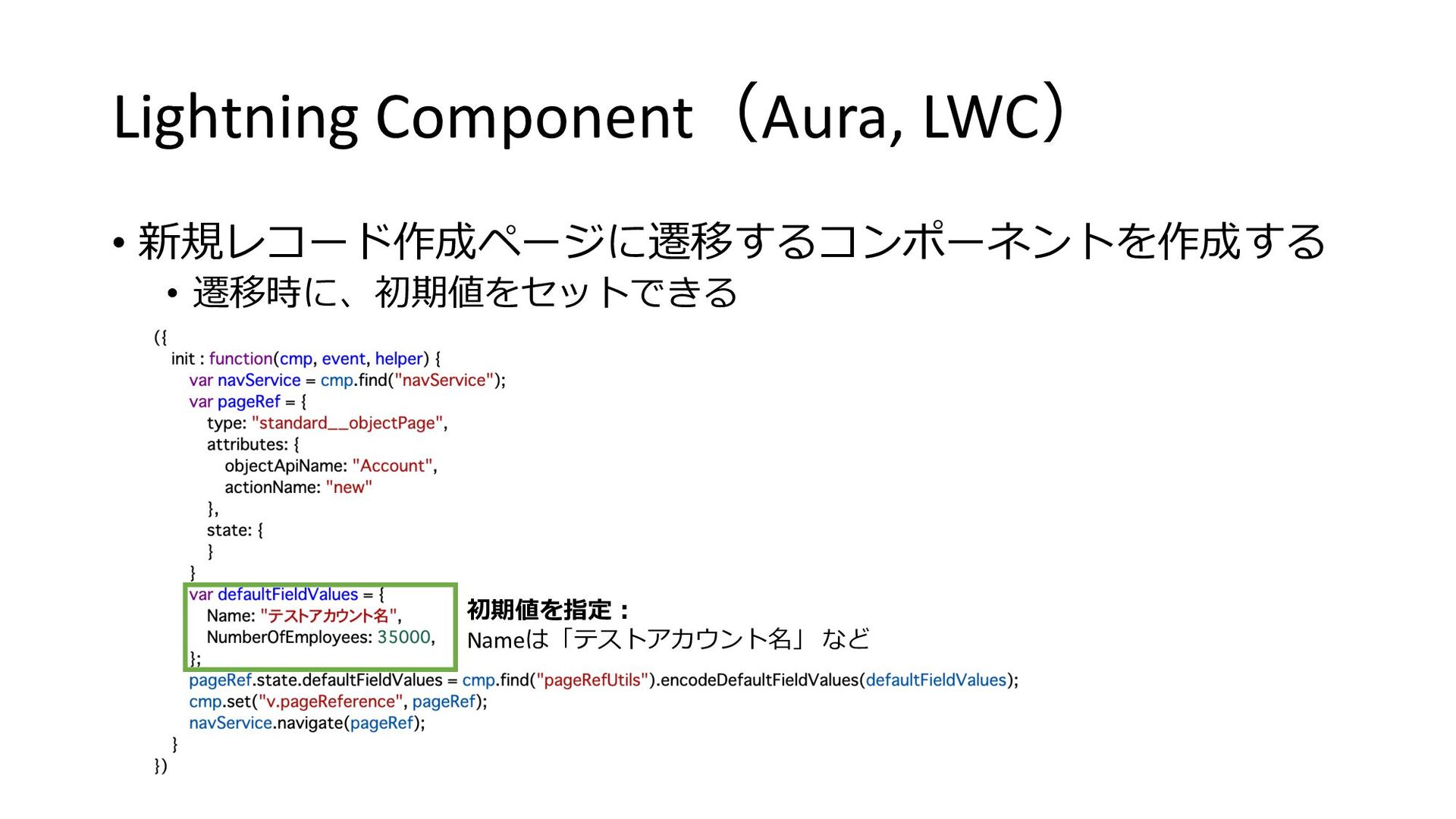 Lightning Component(Aura, LWC) • 新規レコード作成ページに遷移するコンポーネントを作成する • 遷移時に、初期値をセットできる 初期値を指定︓ Nameは「テストアカウント名」 など