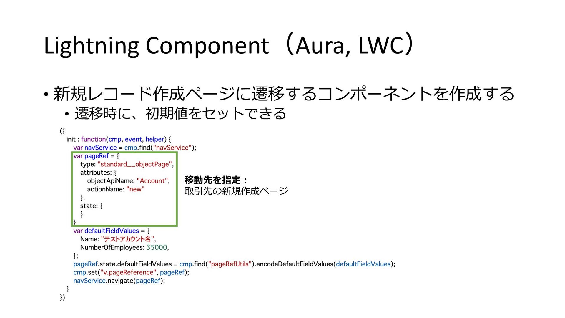 Lightning Component(Aura, LWC) • 新規レコード作成ページに遷移するコンポーネントを作成する • 遷移時に、初期値をセットできる 移動先を指定︓ 取引先の新規作成ページ