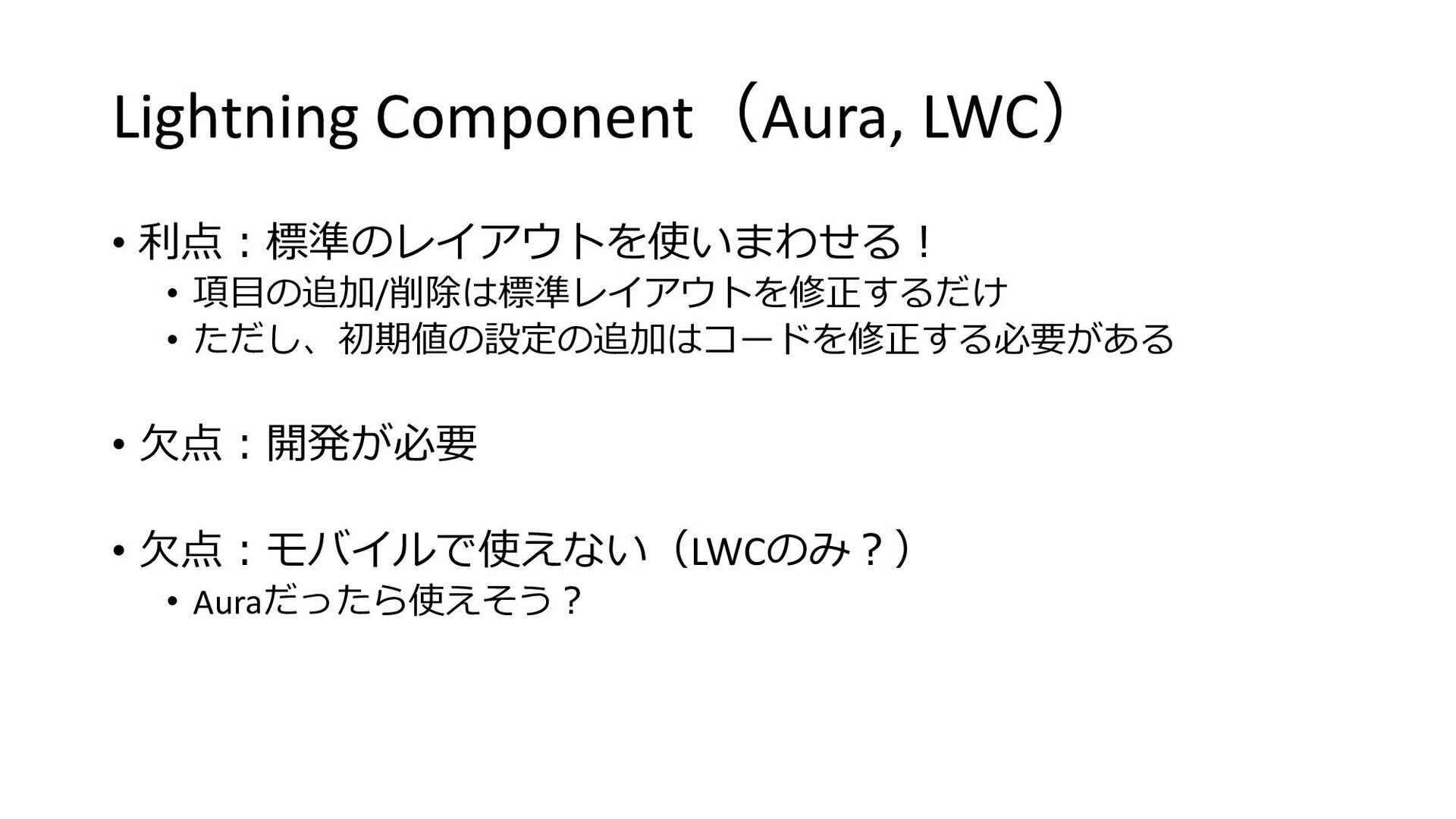 ⽋点︓開発が必要 • ⽋点︓モバイルで使えない(LWCのみ︖) • Auraだったら使えそう︖