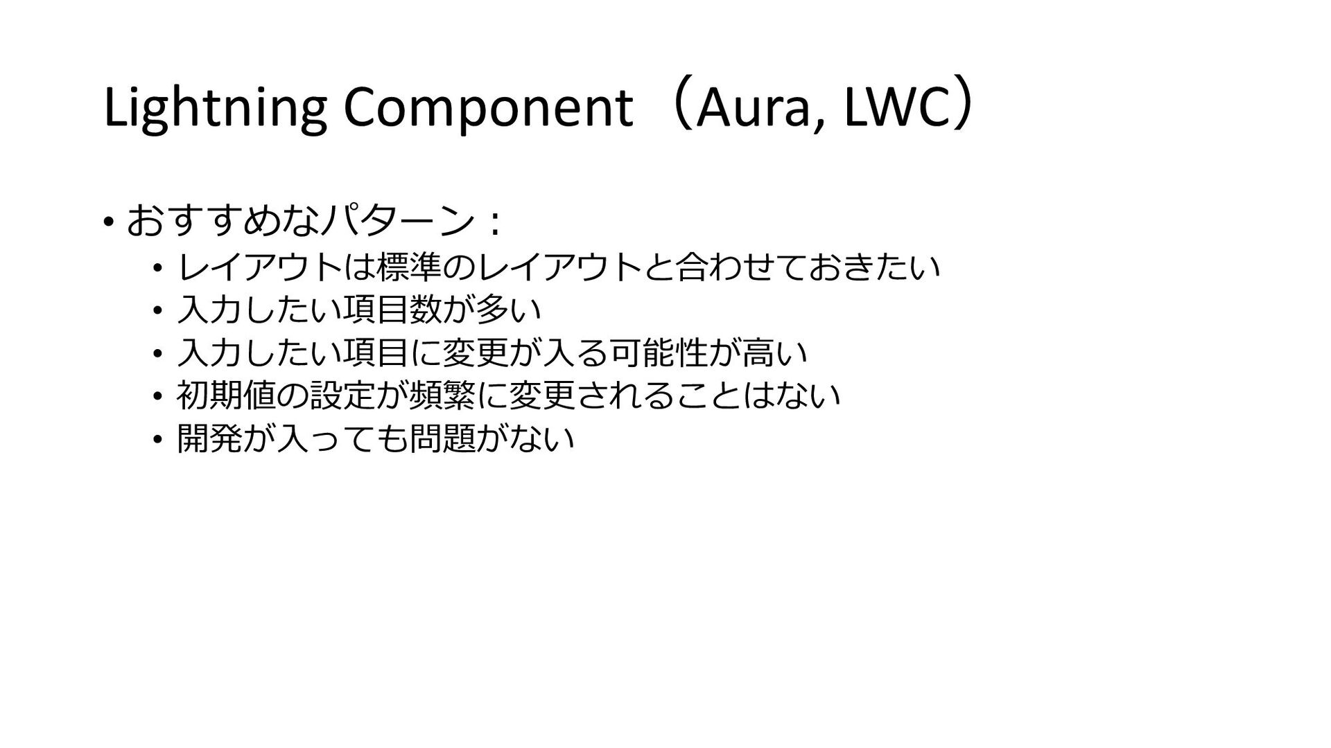 Lightning Component(Aura, LWC) • 利点︓標準のレイアウトを使いまわせる︕ • 項⽬の追加/削除は標準レイアウトを修正するだけ • ただし、初期値の設定の追加はコードを修正する必要がある •