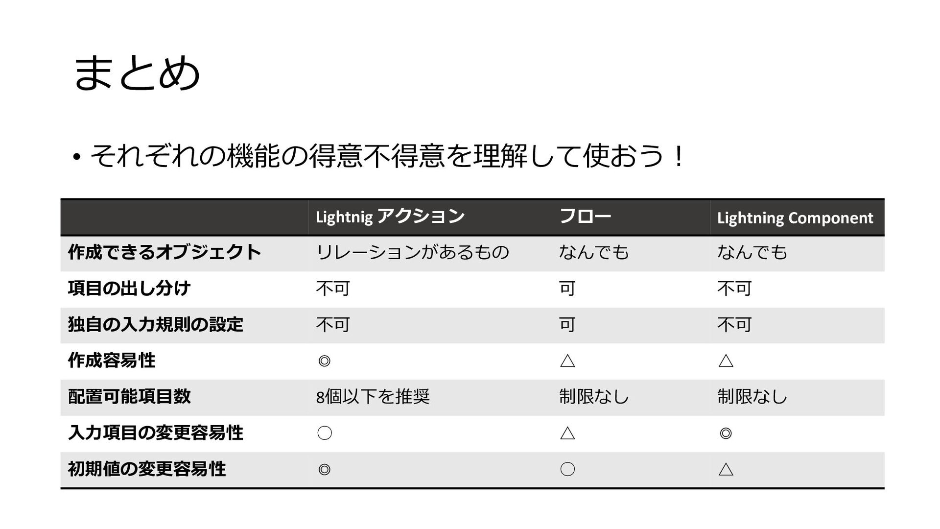 まとめ • それぞれの機能の得意不得意を理解して使おう︕ Lightnig アクション フロー Lightning Component 作成できるオブジェクト リレーションがあるもの