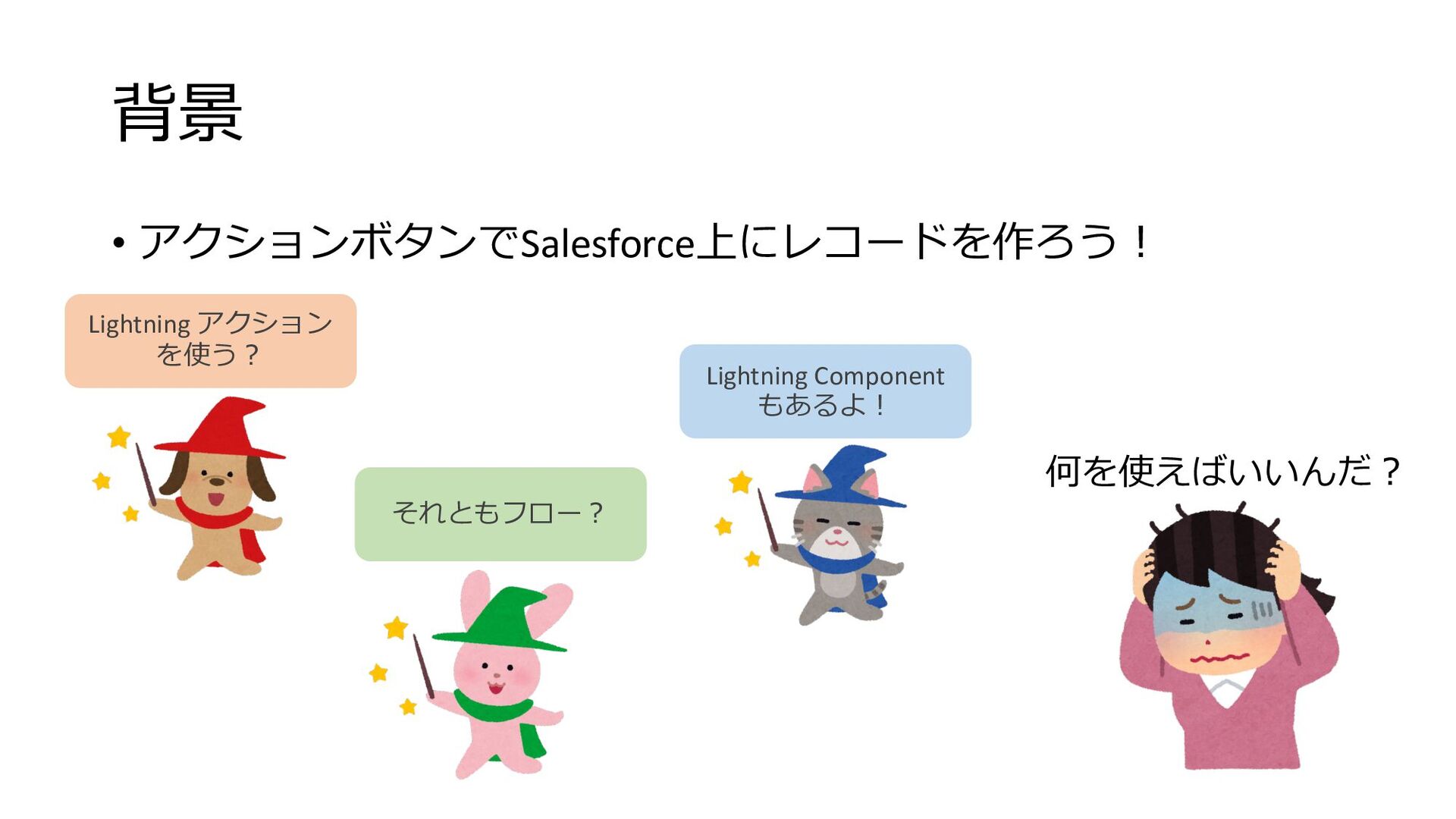 背景 • アクションボタンでSalesforce上にレコードを作ろう︕ Lightning アクション を使う︖ それともフロー︖ Lightning Component もあるよ︕