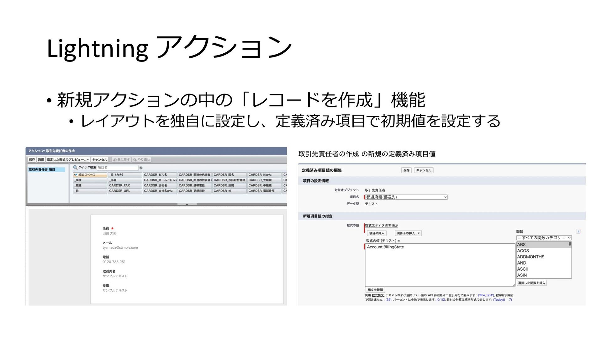 Lightning アクション • 新規アクションの中の「レコードを作成」機能 • レイアウトを独⾃に設定し、定義済み項⽬で初期値を設定する