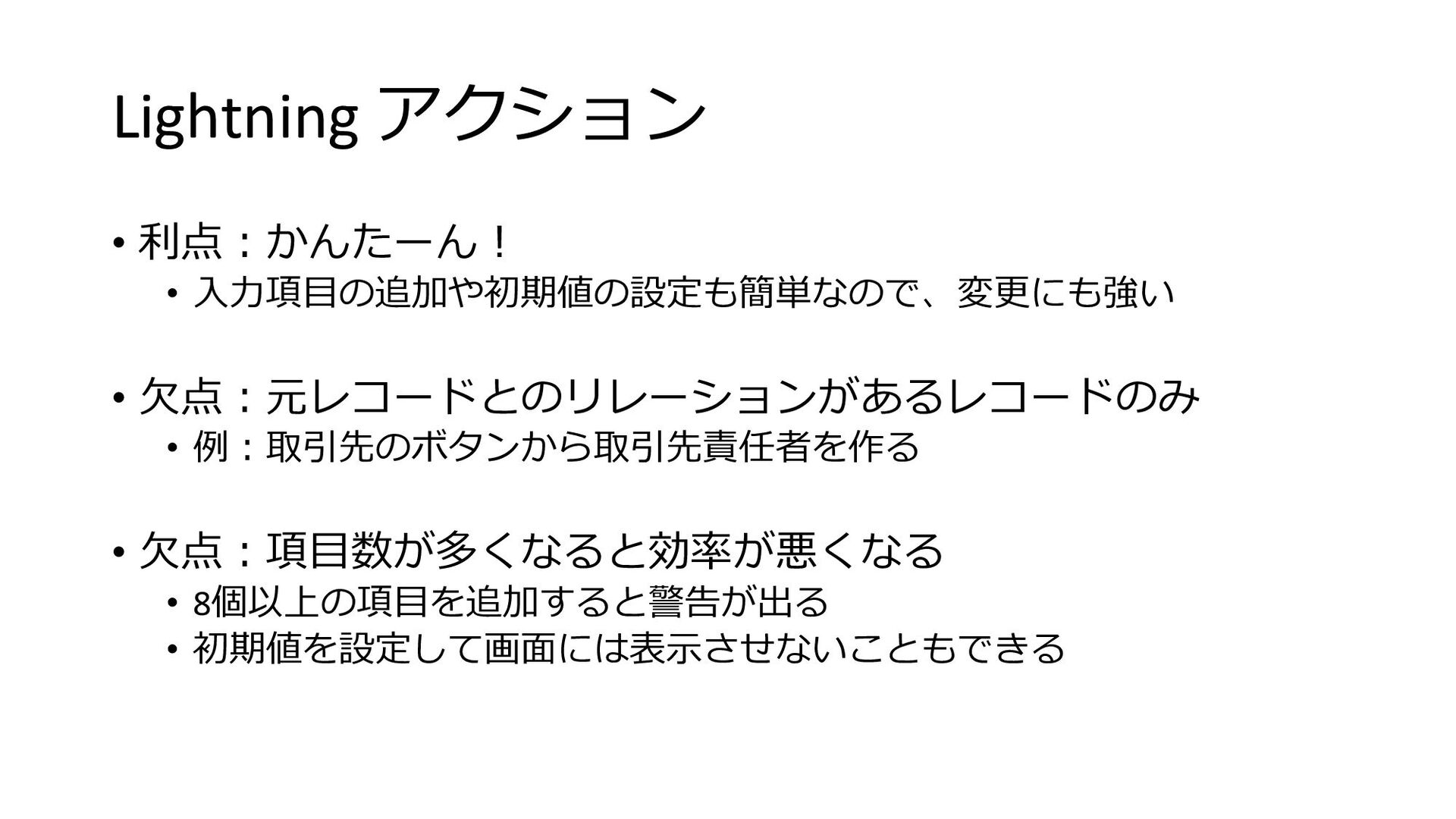 Lightning アクション • 利点︓かんたーん︕ • ⼊⼒項⽬の追加や初期値の設定も簡単なので、変更にも強い • ⽋点︓元レコードとのリレーションがあるレコードのみ • 例︓取引先のボタンから取引先責任者を作る