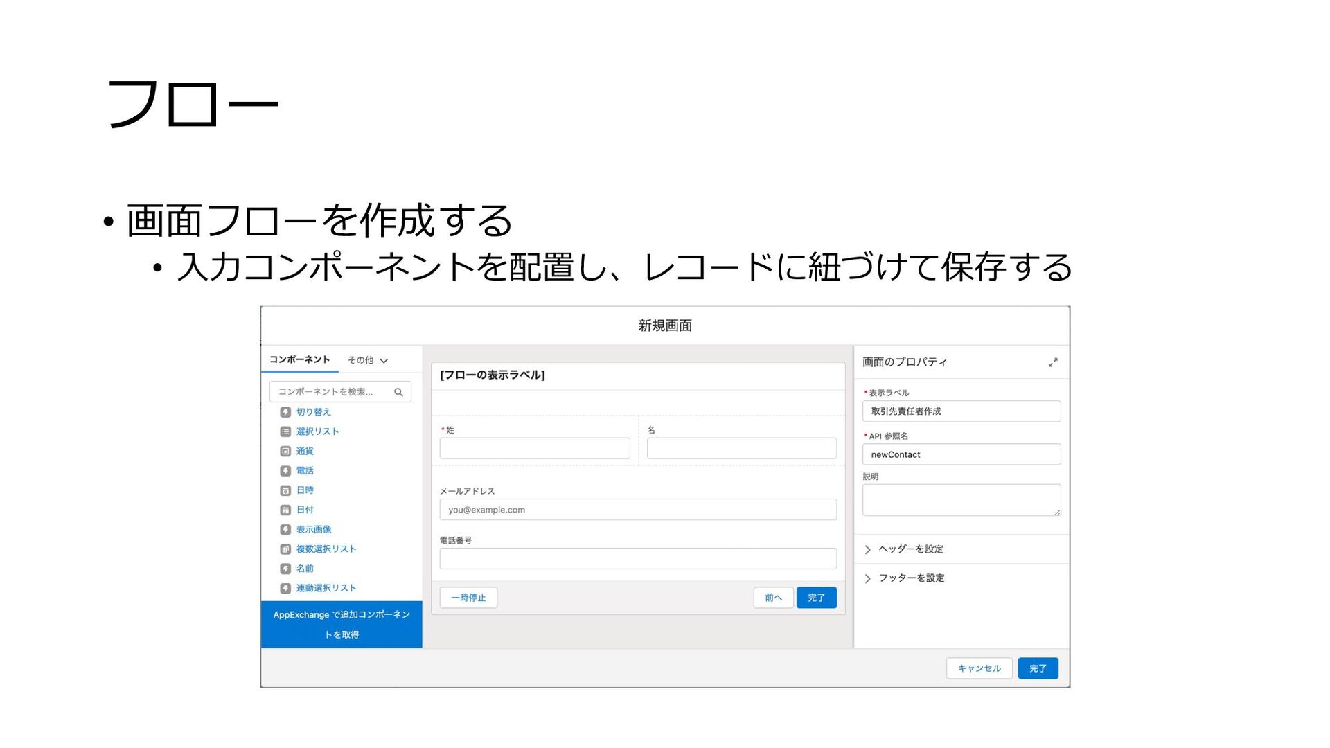 フロー • 画⾯フローを作成する • ⼊⼒コンポーネントを配置し、レコードに紐づけて保存する