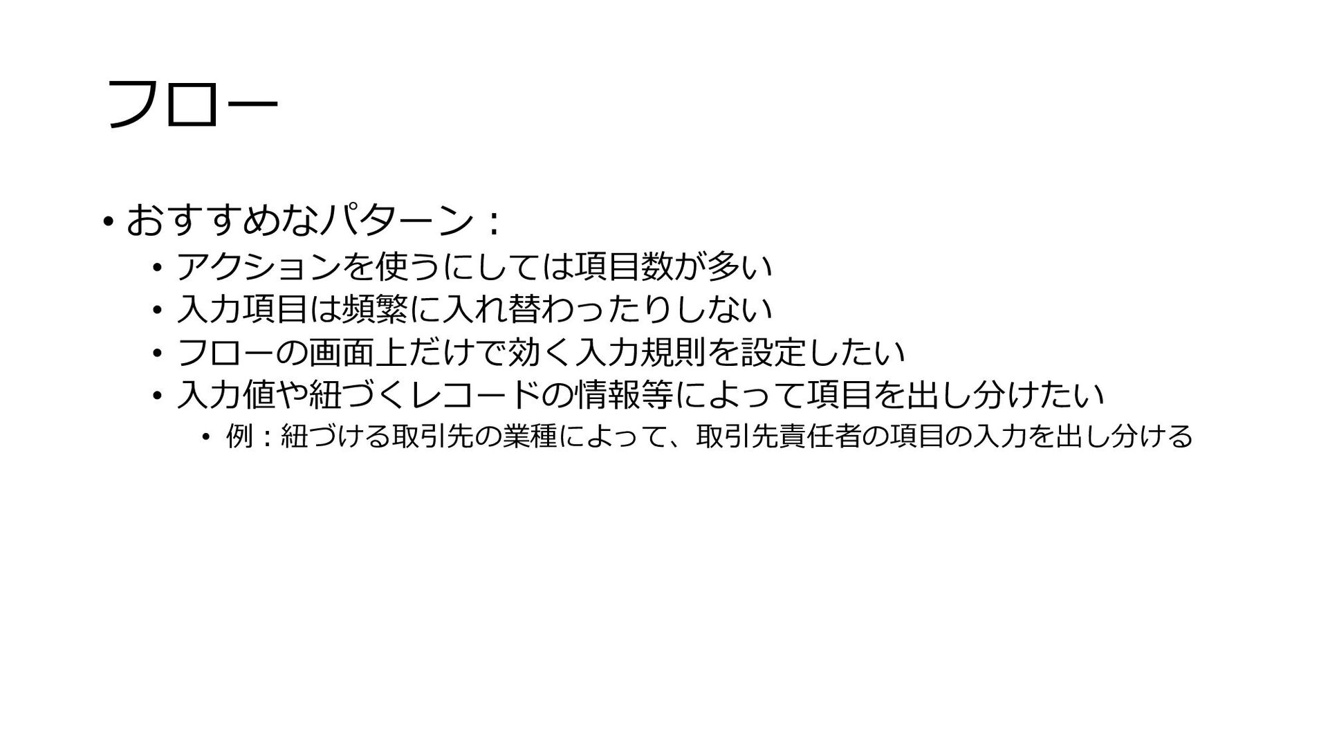 フロー • おすすめなパターン︓ • アクションを使うにしては項⽬数が多い • ⼊⼒項⽬は頻繁に⼊れ替わったりしない • フローの画⾯上だけで効く⼊⼒規則を設定したい •