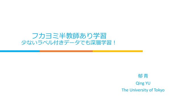 China • Affiliation: Aizawa Laboratory, D3 Graduate School of Information Science and Technology The University of Tokyo • Research interest: Open-set recognition Semi-supervised learning Domain adaptation • HP: yu1ut.com 2