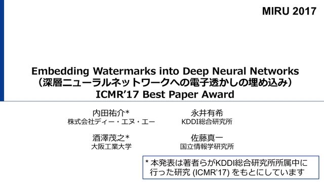 more details, please refer to… Y. Uchida, Y. Nagai, S. Sakazawa, and S. Satoh, “Embedding Watermarks into Deep Neural Networks,” in Proc. of International Conference on Multimedia Retrieval 2017.