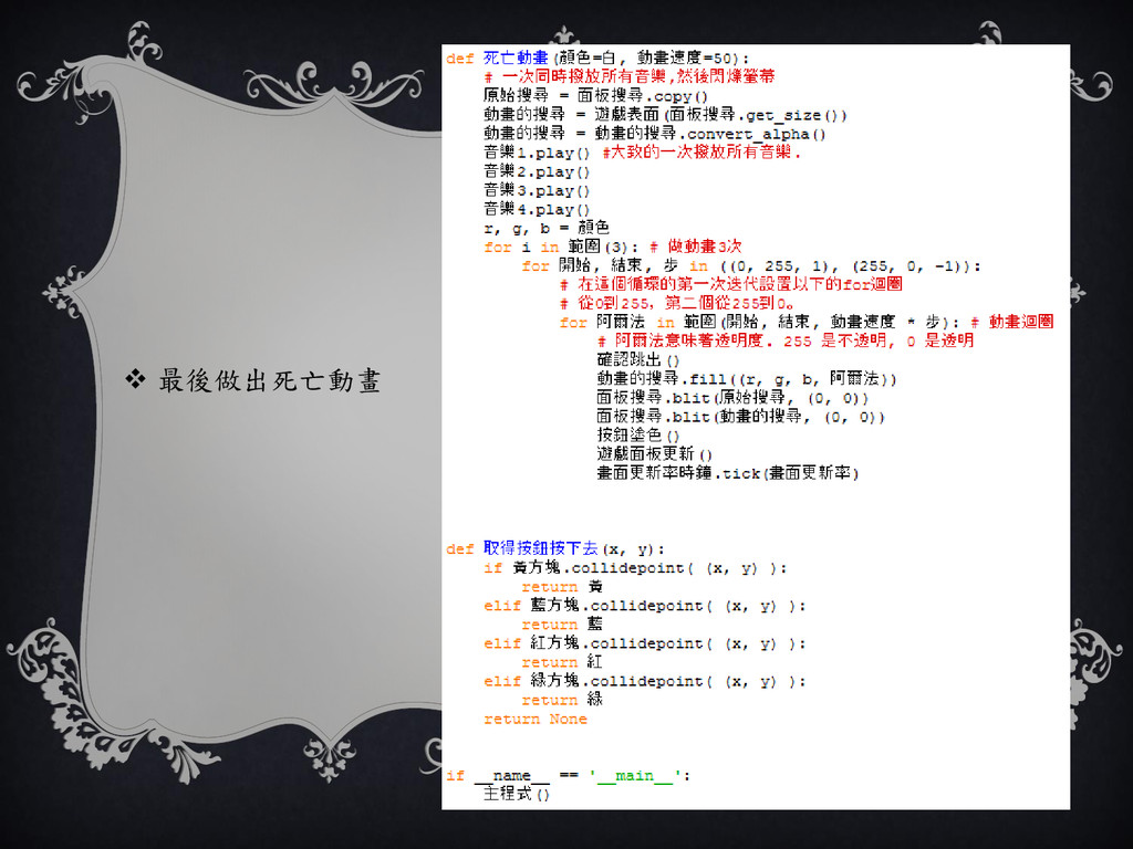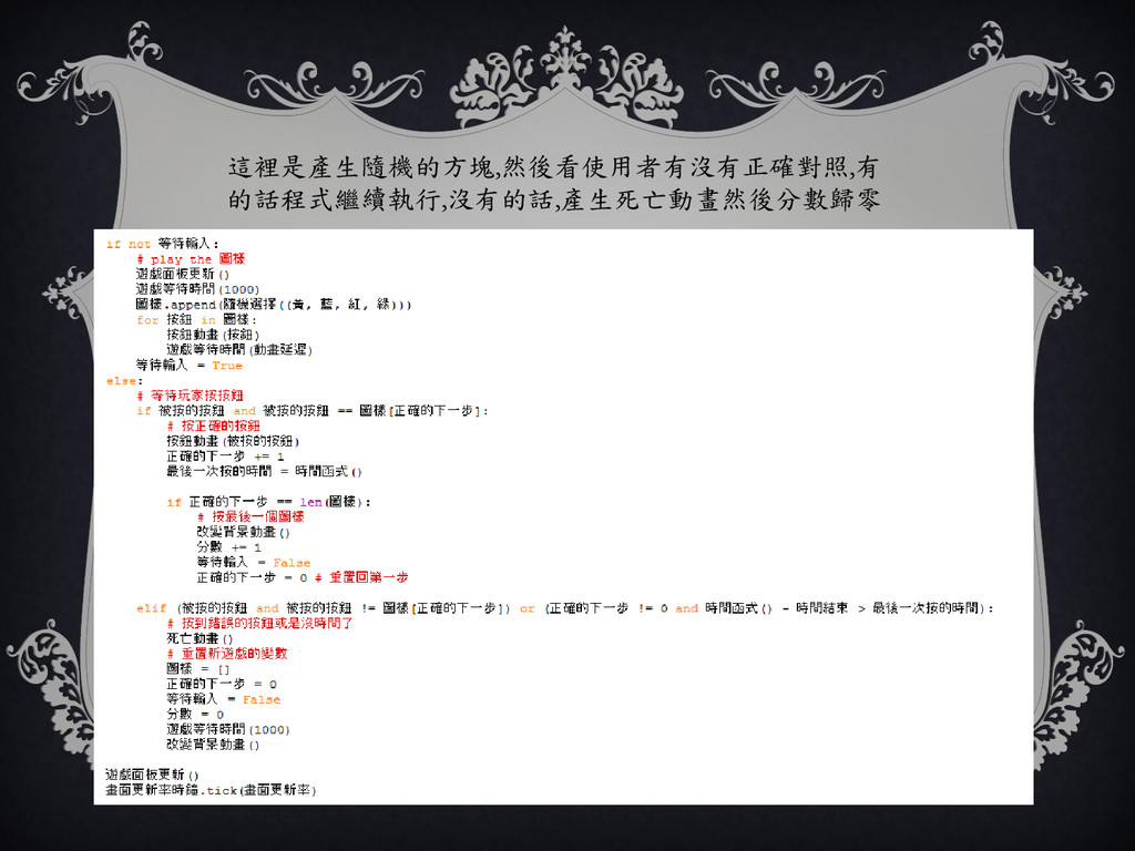 這裡是產生隨機的方塊,然後看使用者有沒有正確對照,有 的話程式繼續執行,沒有的話,產生死亡動畫然後分數歸零