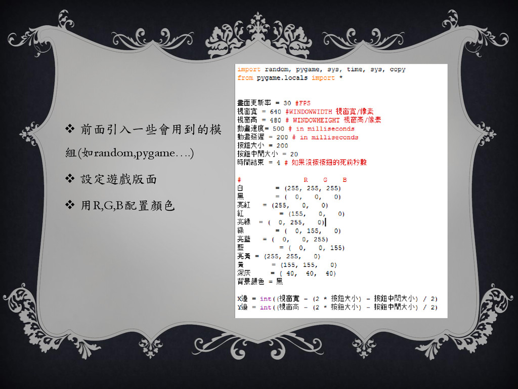 前面引入一些會用到的模 組(如random,pygame….) 設定遊戲版面 用R,G,B配置顏色