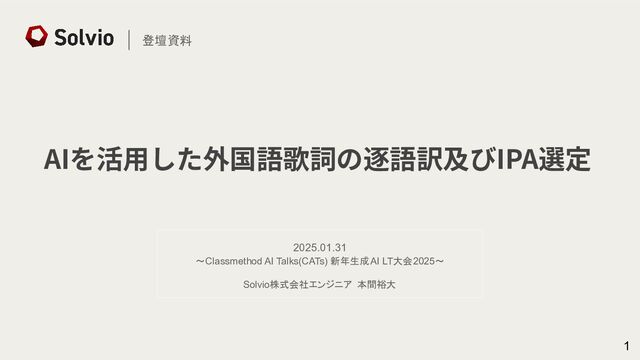 1 AIを活⽤した外国語歌詞の逐語訳及びIPA選定 登壇資料 2025.01.31 〜Classmethod AI Talks(CATs) 新年生成AI LT大会2025〜 Solvio株式会社エンジニア