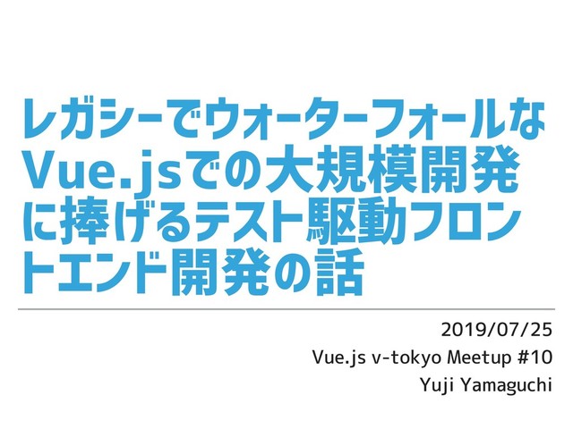 レガシーでウォーターフォールな Vue.jsでの大規模開発 に捧げるテスト駆動フロン トエンド開発の話 2019/07/25 Vue.js v-tokyo Meetup #10 Yuji