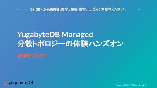 – All Rights Reserved Thank You Follow us on Twitter: twitter.com/YugabyteDB_JP Join us on Slack (#yb-japan-users): www.yugabyte.com/slack Star us on GitHub: github.com/yugabyte/yugabyte-db