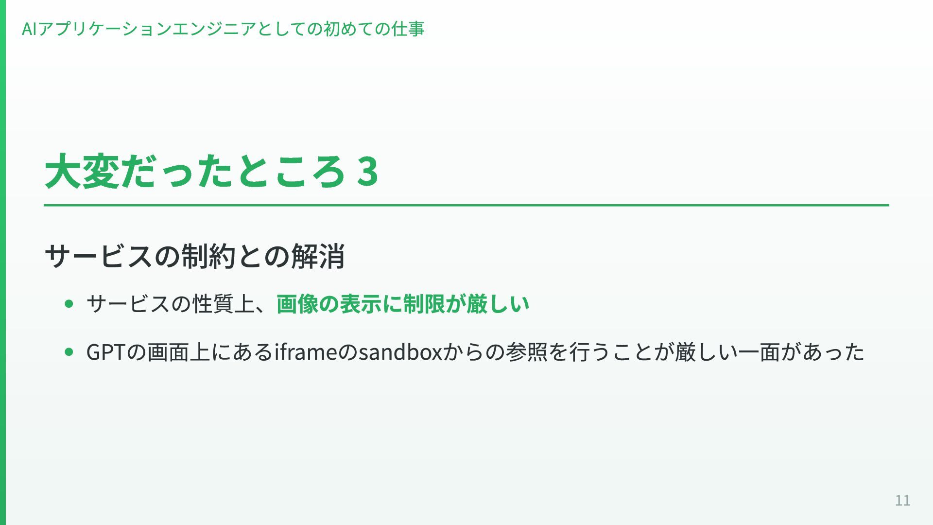 大変だったところ 3 サービスの制約との解消 サービスの性質上、画像の表示に制限が厳しい GPTの画面上にあるiframeのsandboxからの参照を行うことが厳しい一面があった AIアプリケーションエンジニアとしての初めての仕事 11