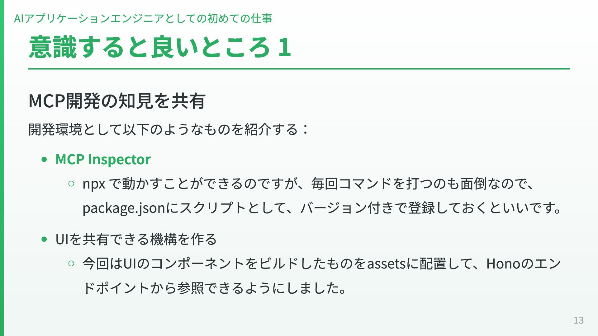 意識すると良いところ 1 MCP開発の知見を共有 開発環境として以下のようなものを紹介する: MCP Inspector npx で動かすことができるのですが、毎回コマンドを打つのも面倒なので、 package.jsonにスクリプトとして、バージョン付きで登録しておくといいです。 UIを共有できる機構を作る