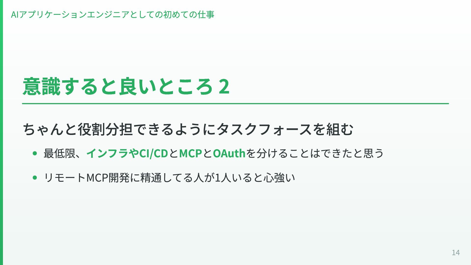 意識すると良いところ 2 ちゃんと役割分担できるようにタスクフォースを組む 最低限、インフラやCI/CDとMCPとOAuthを分けることはできたと思う リモートMCP開発に精通してる人が1人いると心強い AIアプリケーションエンジニアとしての初めての仕事 14