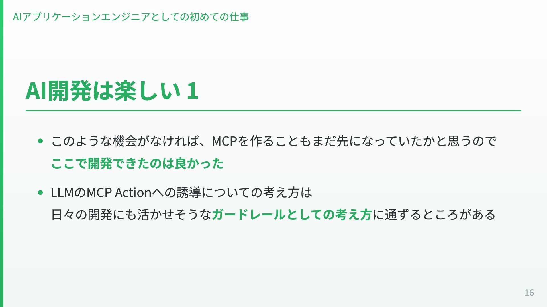 AI開発は楽しい 1 このような機会がなければ、MCPを作ることもまだ先になっていたかと思うので ここで開発できたのは良かった LLMのMCP Actionへの誘導についての考え方は 日々の開発にも活かせそうなガードレールとしての考え方に通ずるところがある AIアプリケーションエンジニアとしての初めての仕事 16