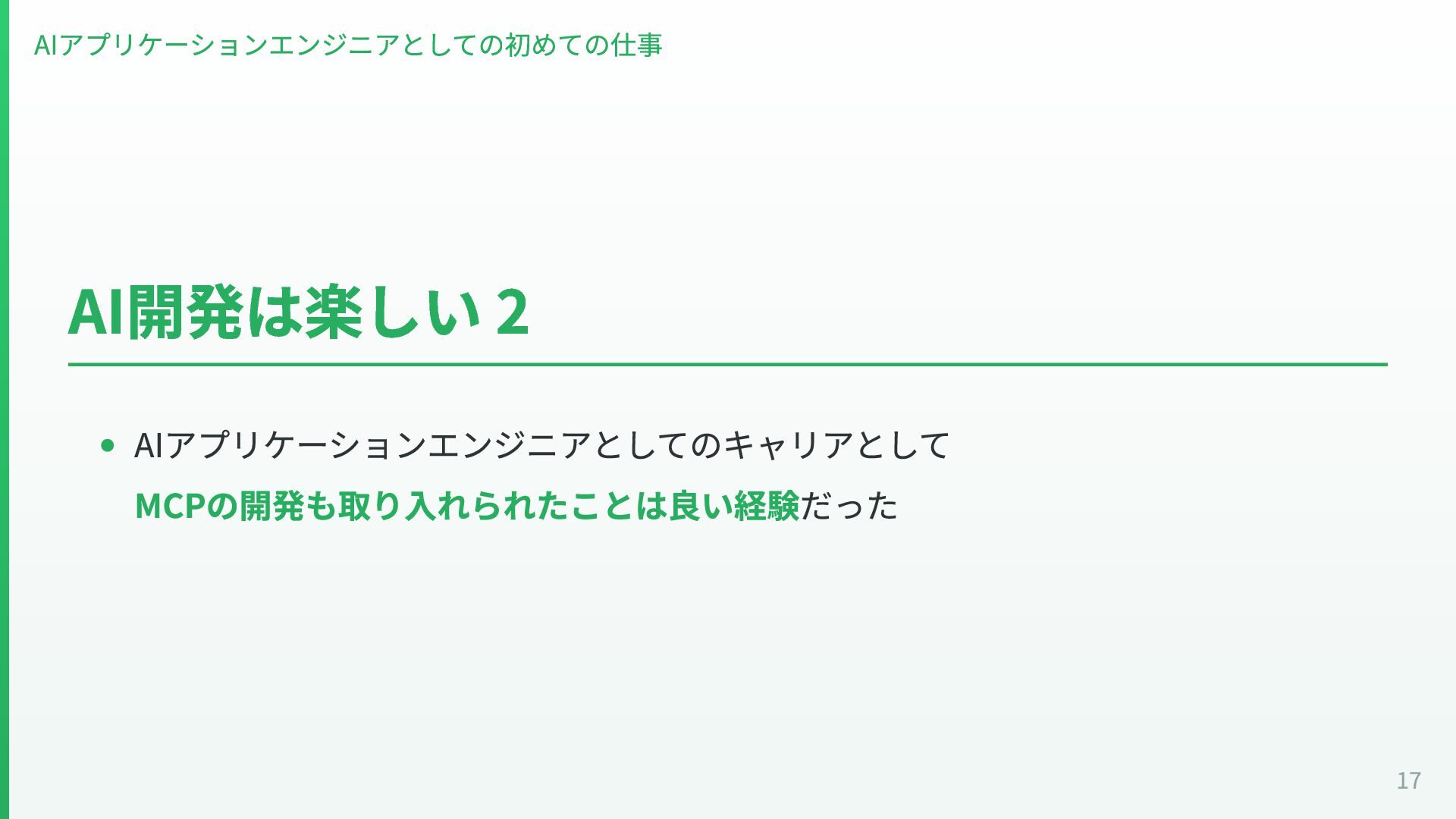 AI開発は楽しい 2 AIアプリケーションエンジニアとしてのキャリアとして MCPの開発も取り入れられたことは良い経験だった AIアプリケーションエンジニアとしての初めての仕事 17