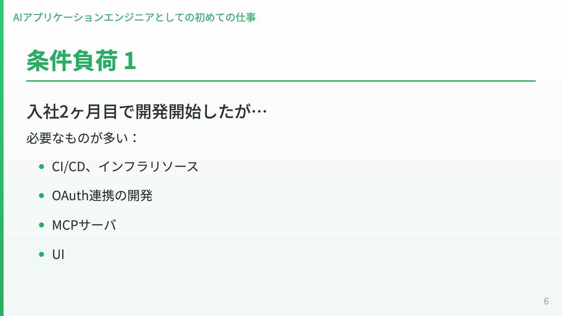 条件負荷 1 入社2ヶ月目で開発開始したが… 必要なものが多い: CI/CD、インフラリソース OAuth連携の開発 MCPサーバ UI AIアプリケーションエンジニアとしての初めての仕事 6