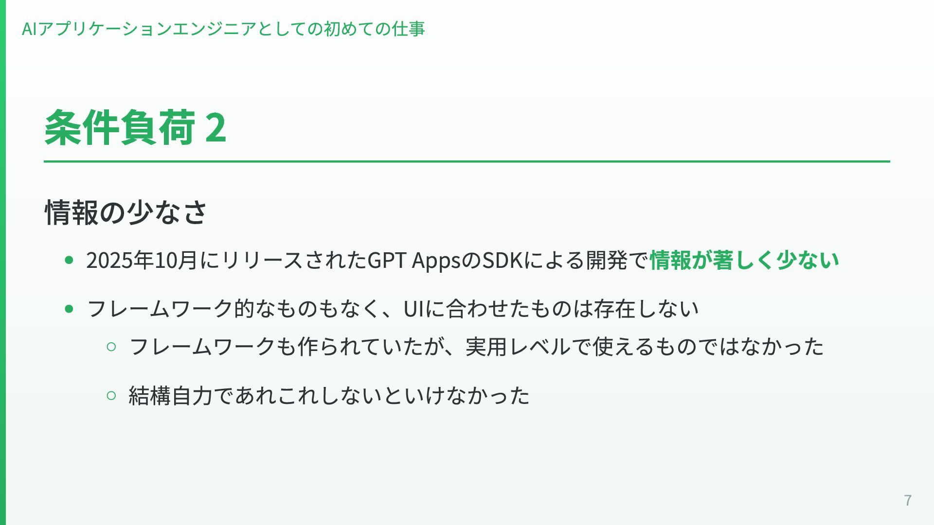 条件負荷 2 情報の少なさ 2025年10月にリリースされたGPT AppsのSDKによる開発で情報が著しく少ない フレームワーク的なものもなく、UIに合わせたものは存在しない フレームワークも作られていたが、実用レベルで使えるものではなかった 結構自力であれこれしないといけなかった AIアプリケーションエンジニアとしての初めての仕事 7
