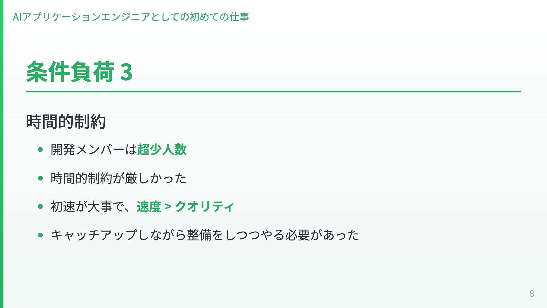 条件負荷 3 時間的制約 開発メンバーは超少人数 時間的制約が厳しかった 初速が大事で、速度 > クオリティ キャッチアップしながら整備をしつつやる必要があった AIアプリケーションエンジニアとしての初めての仕事