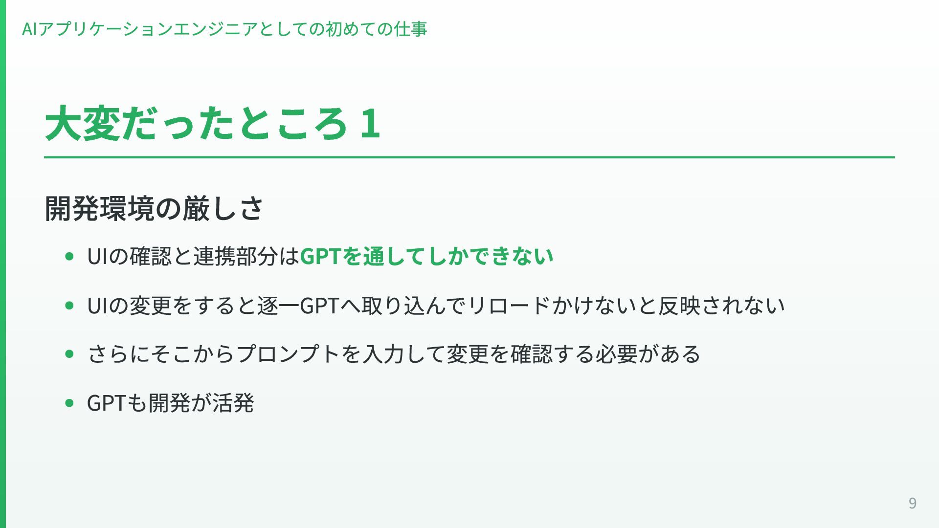大変だったところ 1 開発環境の厳しさ UIの確認と連携部分はGPTを通してしかできない UIの変更をすると逐一GPTへ取り込んでリロードかけないと反映されない さらにそこからプロンプトを入力して変更を確認する必要がある GPTも開発が活発 AIアプリケーションエンジニアとしての初めての仕事 9