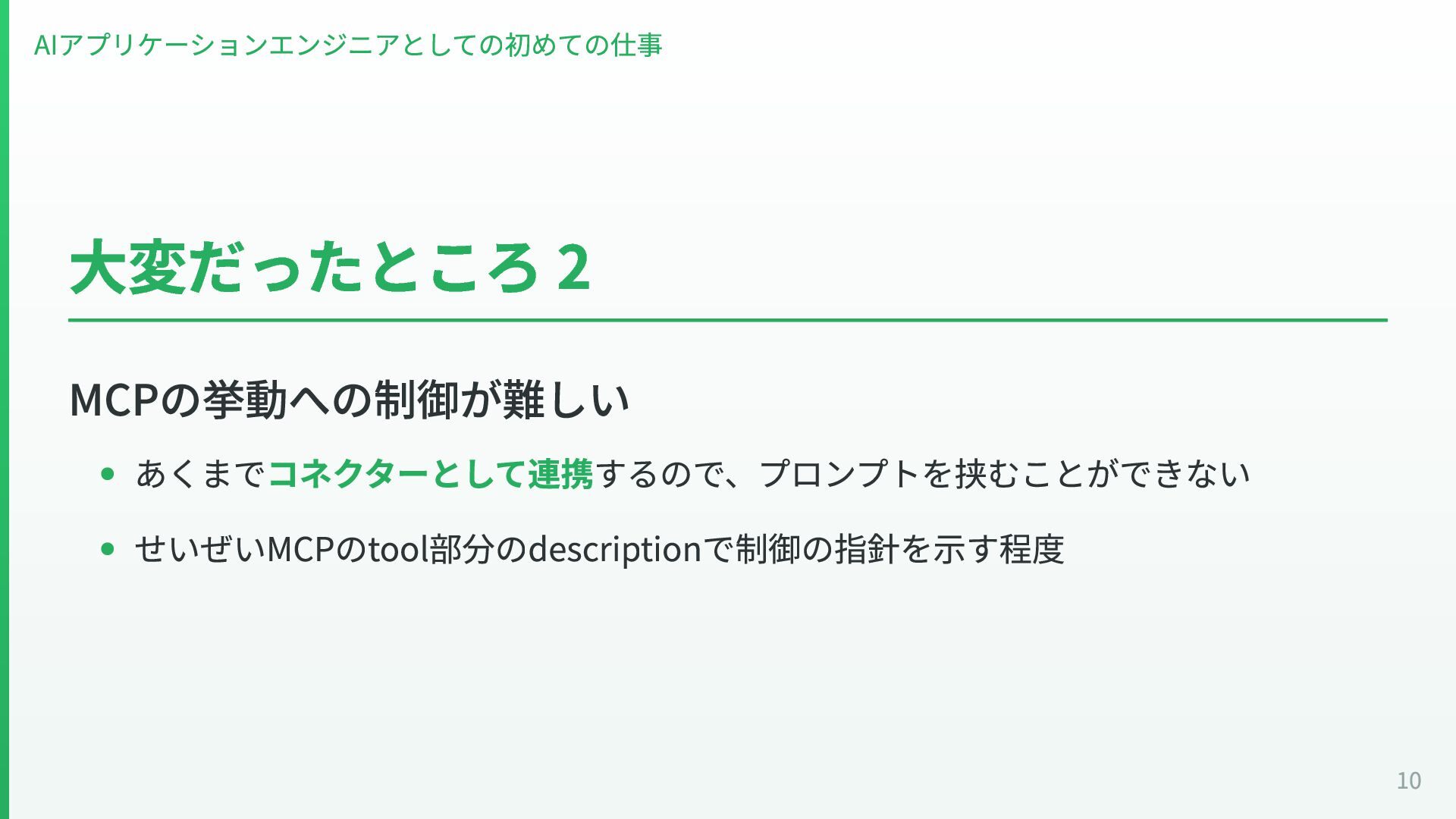 大変だったところ 2 MCPの挙動への制御が難しい あくまでコネクターとして連携するので、プロンプトを挟むことができない せいぜいMCPのtool部分のdescriptionで制御の指針を示す程度 AIアプリケーションエンジニアとしての初めての仕事 10