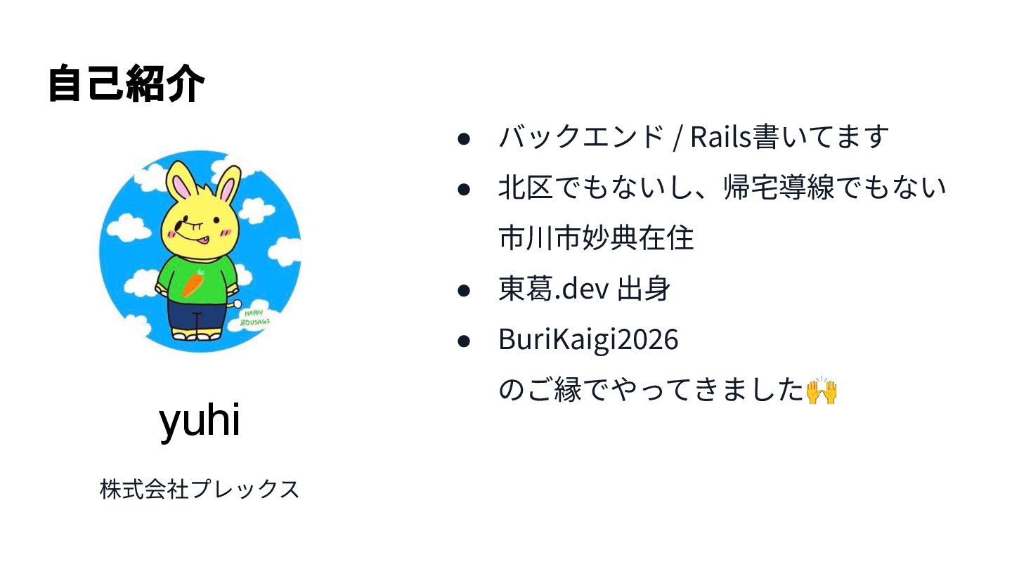 自己紹介 yuhi 株式会社プレックス • バックエンド / Rails書いてます • 北区でもないし、帰宅導線でもない 市川市妙典在住