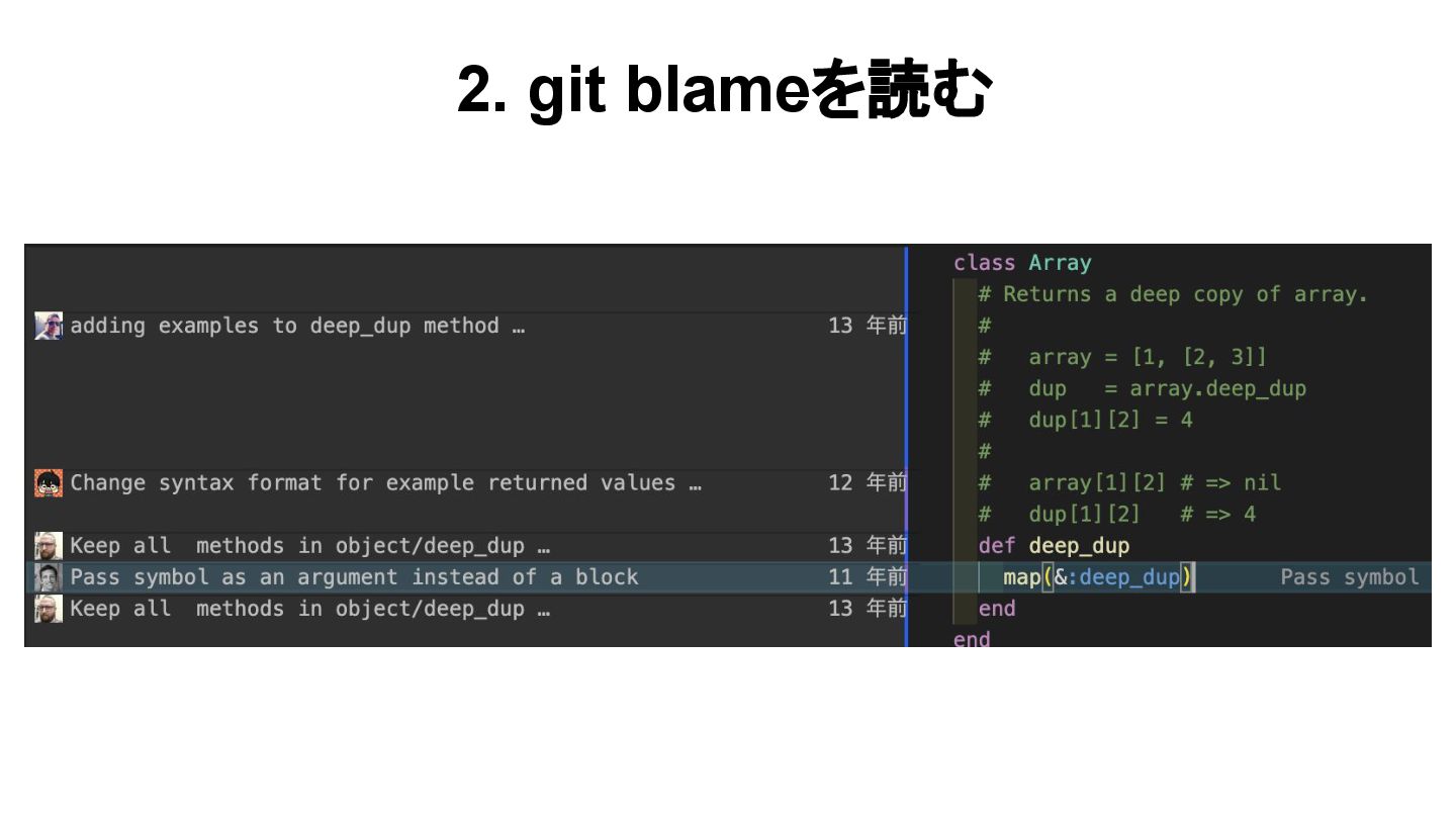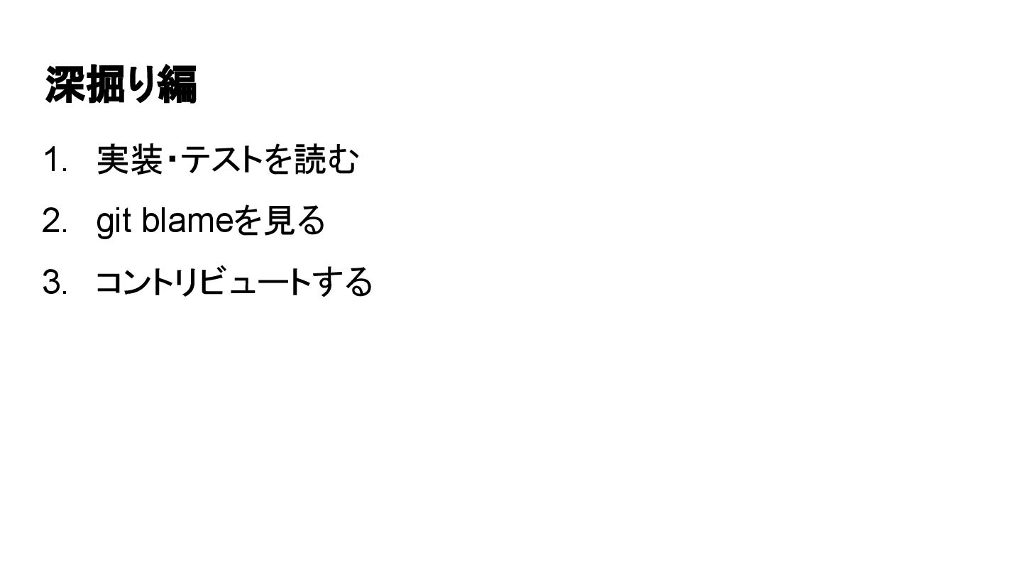 深掘り編 1. 実装・テストを読む 2. git blameを見る 3. コントリビュートする