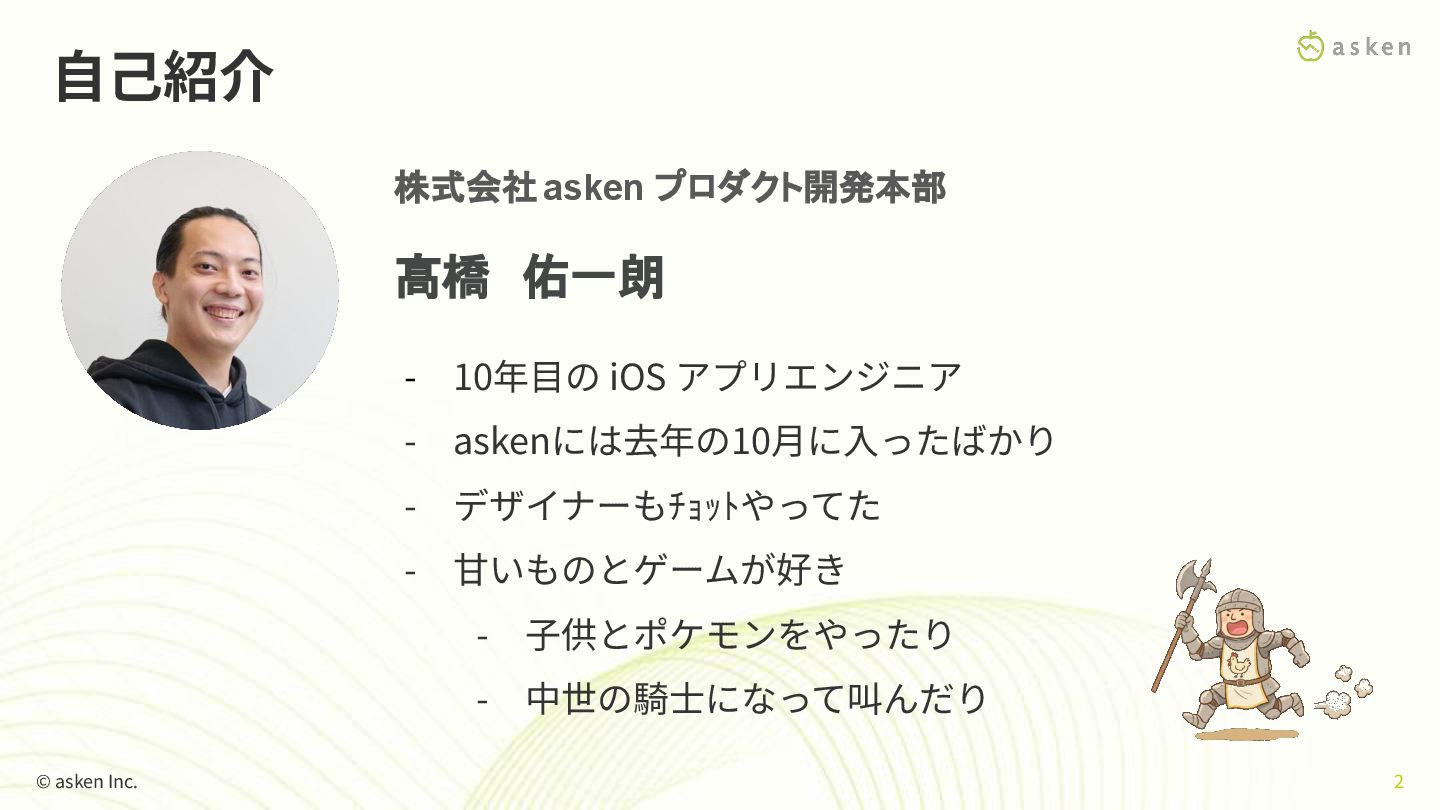 iOS アプリエンジニア - askenには去年の10⽉に⼊ったばかり - デザイナーもチョットやってた - ⽢いものとゲームが好き - ⼦供と育成ゲームをやったり - 中世の騎⼠になって叫んだり