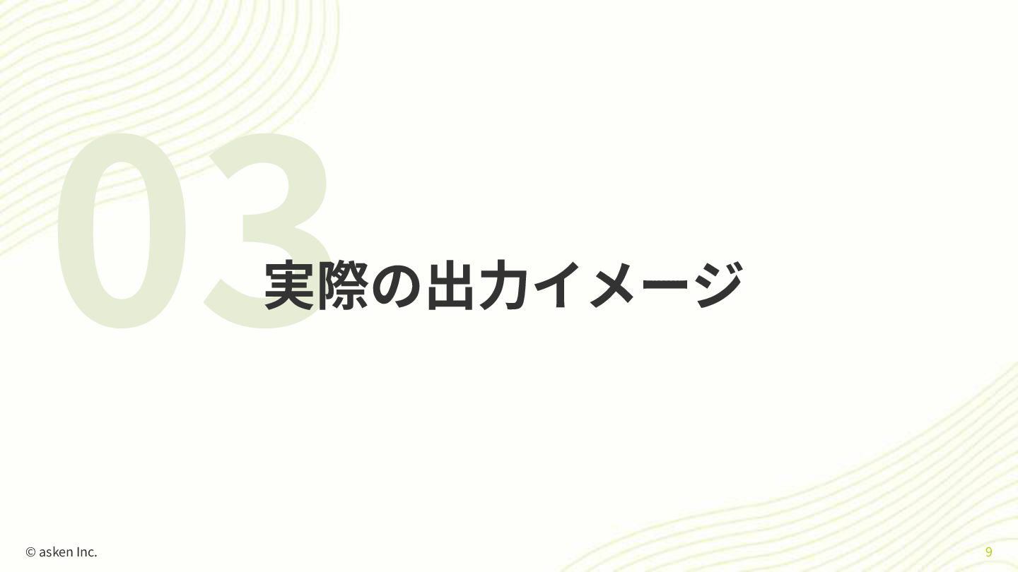 03 実際の出⼒イメージ © asken Inc. 9