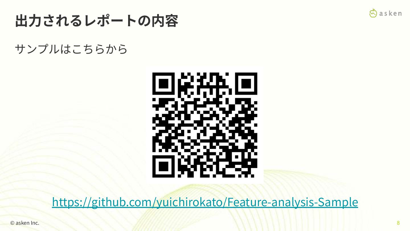 出⼒されるレポートの内容 サンプルはこちらから © asken Inc. 8 https://github.com/yuichirokato/Feature-analysis-Sample