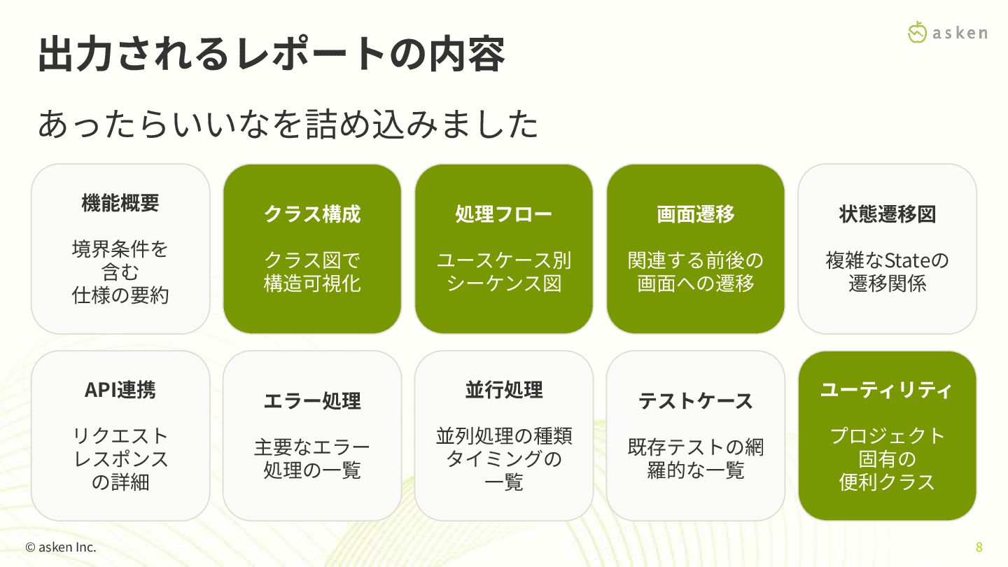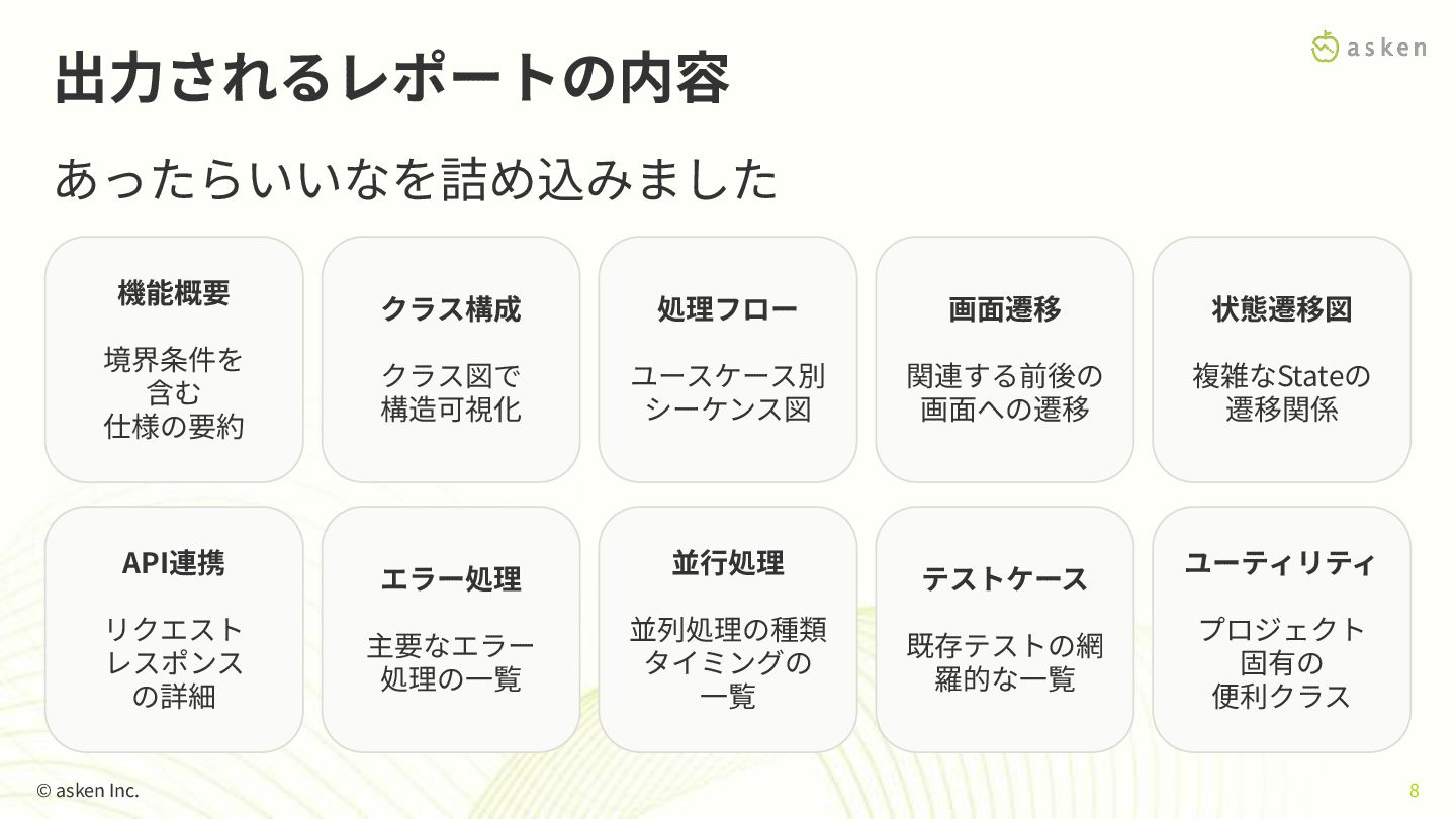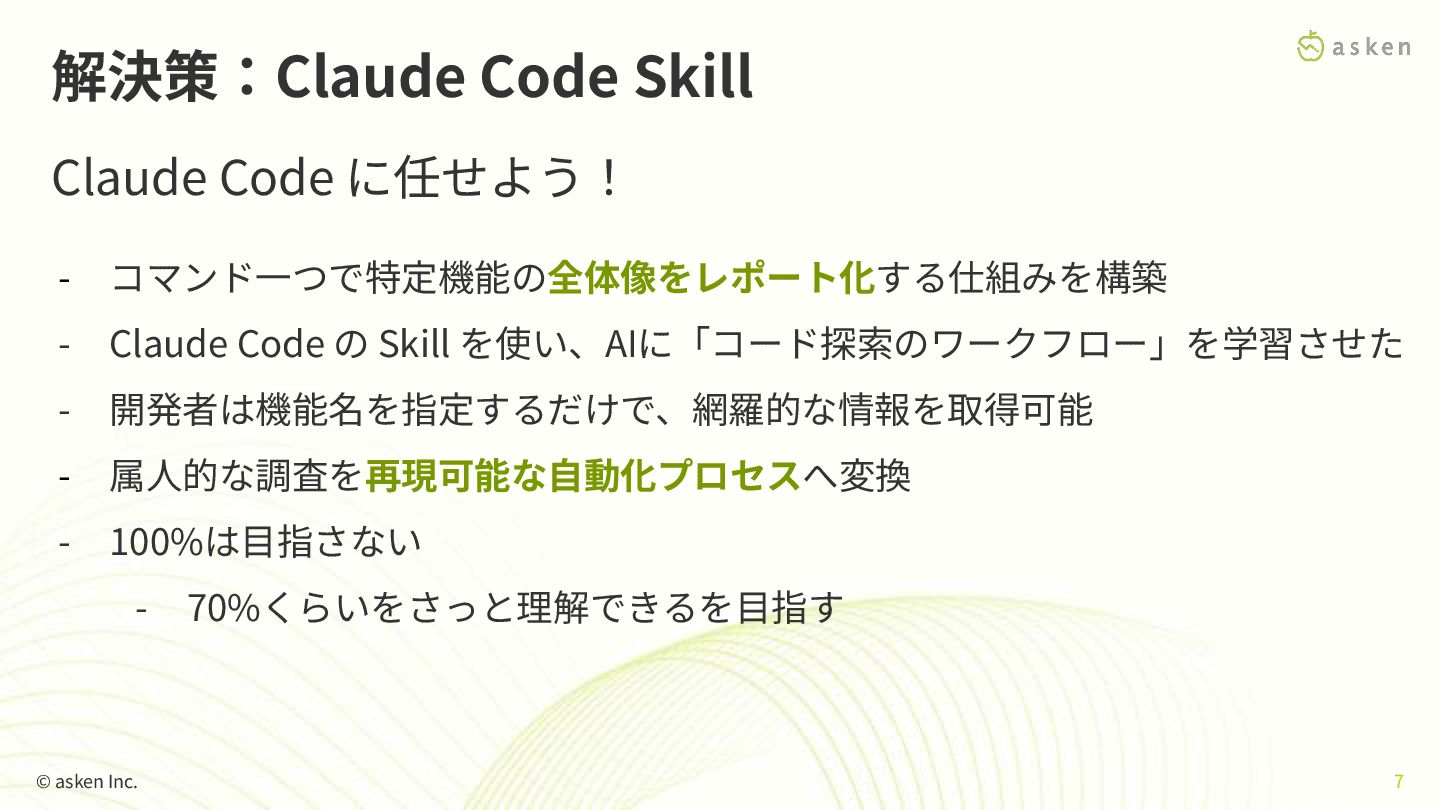 Code の Skill を使い、AIに「コード探索のワークフロー」を学習させた - 開発者は機能名を指定するだけで、網羅的な情報を取得可能 - 属⼈的な調査を再現可能な⾃動化プロセスへ変換 - 100%は⽬指さない - 70%くらいをさっと理解できるを⽬指す © asken Inc. 7