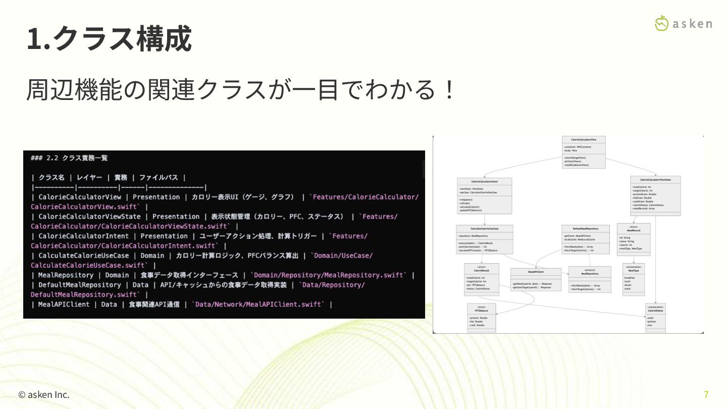 1.クラス構成 周辺機能の関連クラスが⼀⽬でわかる! © asken Inc. 7