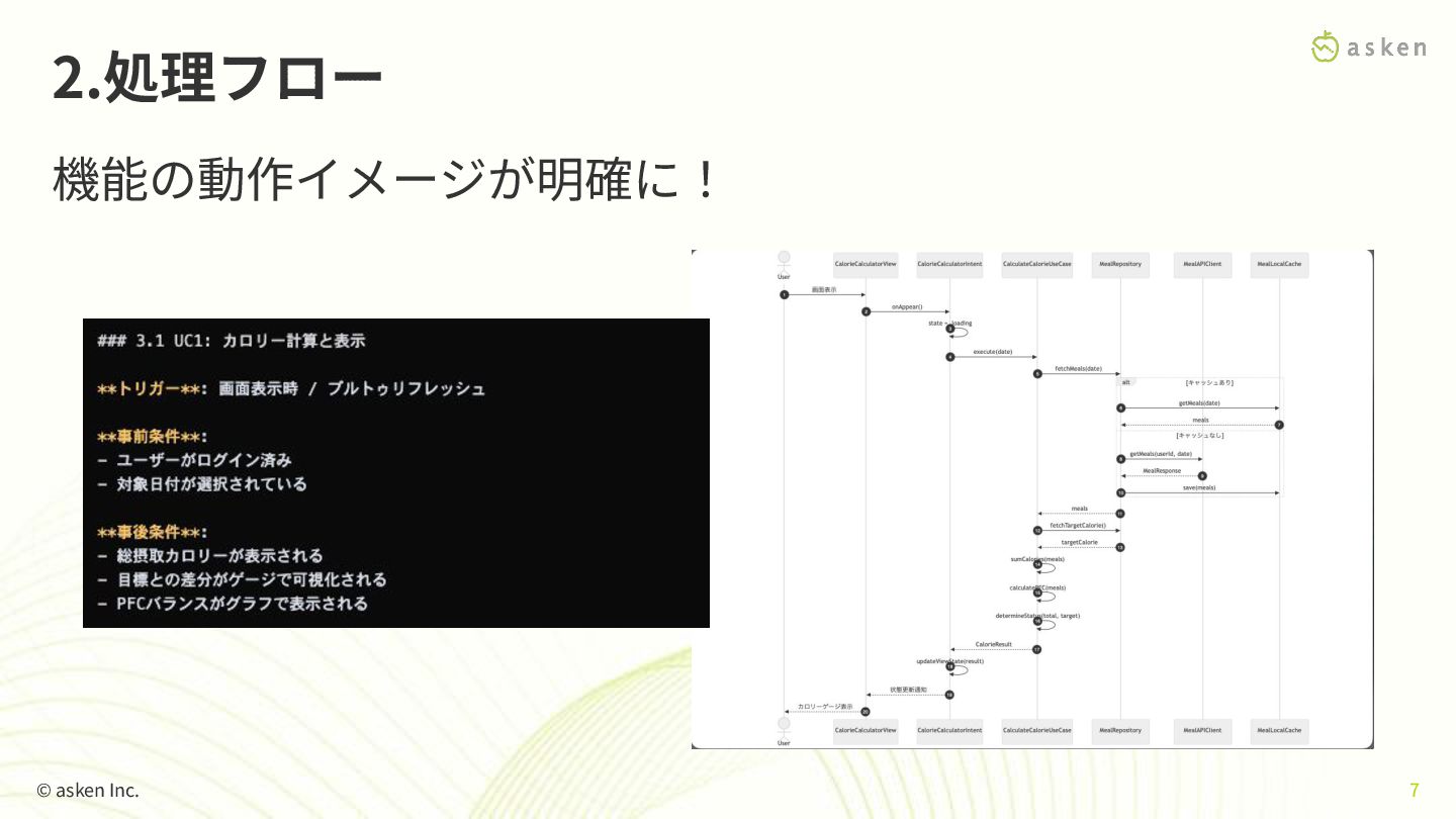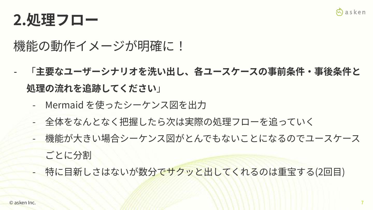 ごとに分割 - 特に⽬新しさはないが数分でサクッと出してくれるのは重宝する(2回⽬) 2.処理フロー 機能の動作イメージが明確に! © asken Inc. 7