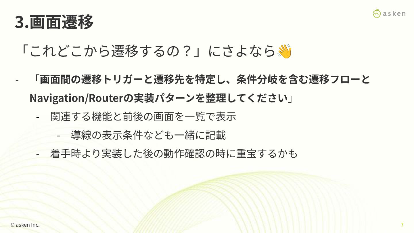 3.画⾯遷移 「これどこから遷移するの?」にさよなら👋 © asken Inc. 7