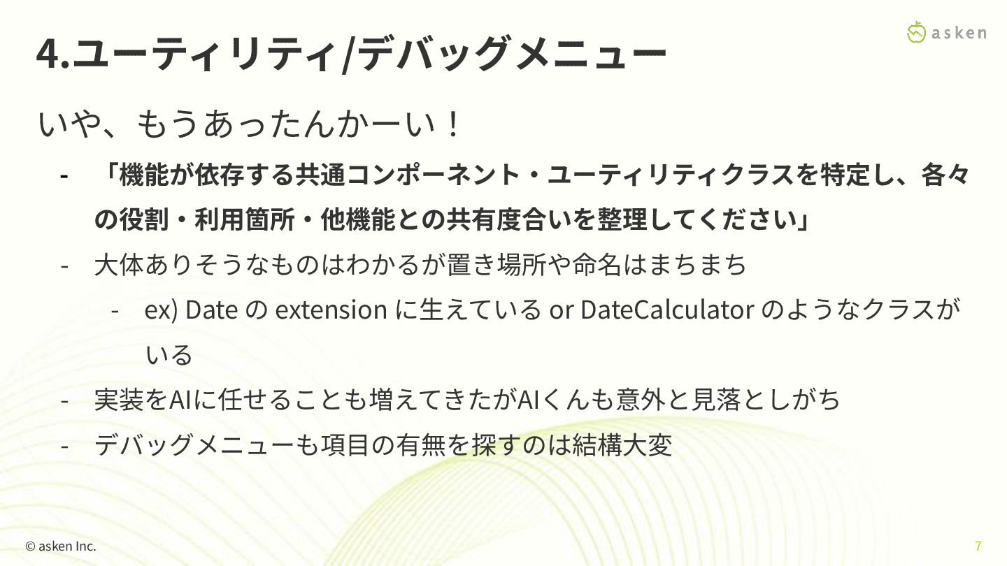 に⽣えている or DateCalculator のようなクラスが いる - 実装をAIに任せることも増えてきたがAIくんも意外と⾒落としがち - デバッグメニューも項⽬の有無を探すのは結構⼤変 4.ユーティリティ/デバッグメニュー いや、もうあったんかーい! © asken Inc. 7