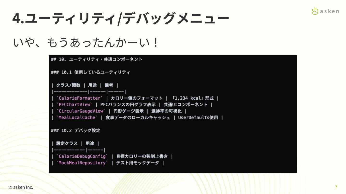 4.ユーティリティ/デバッグメニュー いや、もうあったんかーい! © asken Inc. 7