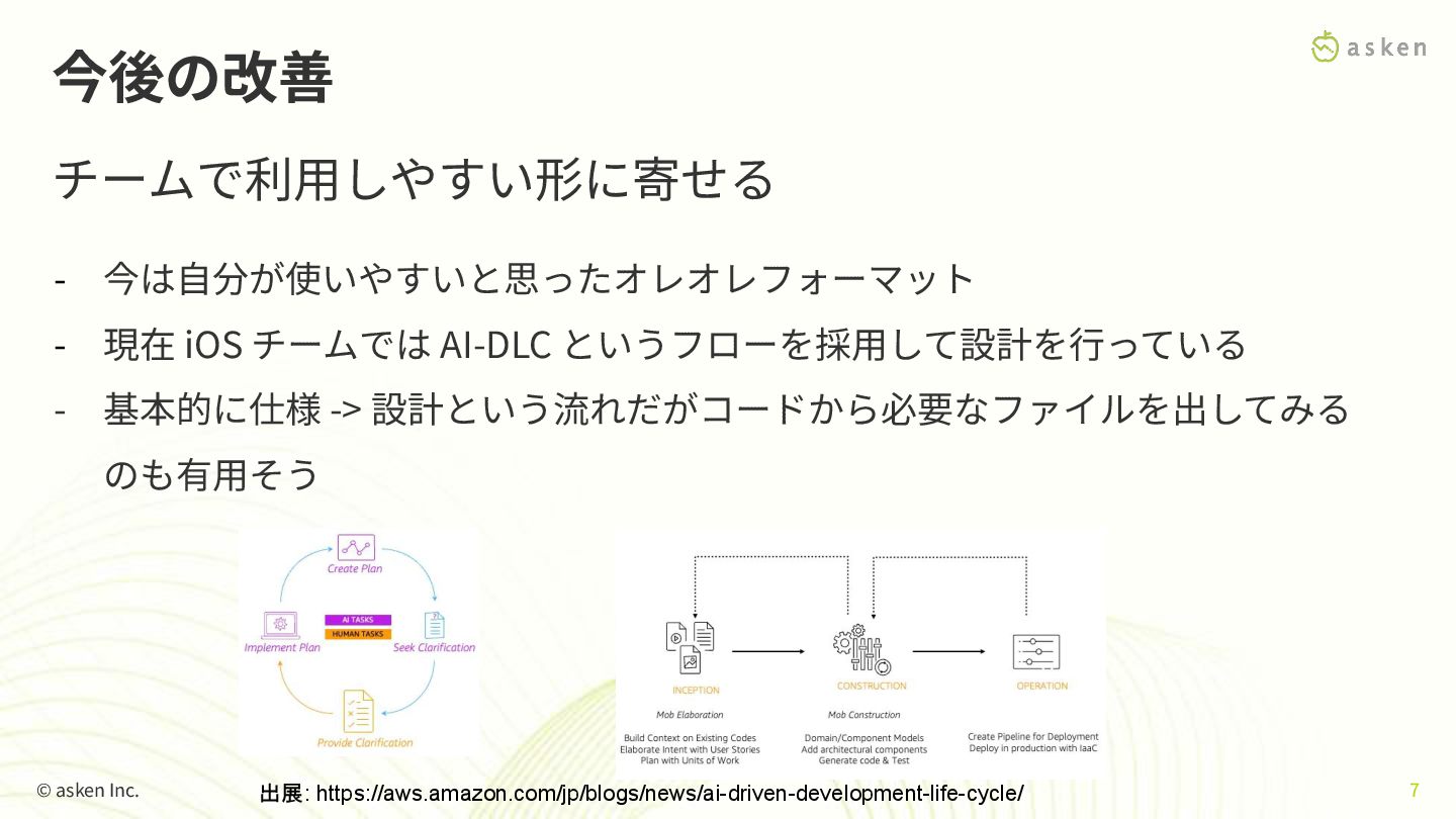 -> 設計という流れだがコードから必要なファイルを出してみる のも有⽤そう 今後の改善 チームで利⽤しやすい形に寄せる © asken Inc. 7 出展: https://aws.amazon.com/jp/blogs/news/ai-driven-development-life-cycle/