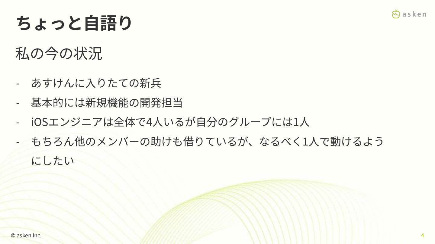 ちょっと⾃語り 私の今の状況 - あすけんに⼊りたての新兵 - 基本的には新規機能の開発担当 - iOSエンジニアは全体で4⼈いるが⾃分のグループには1⼈ - もちろん他のメンバーの助けも借りているが、なるべく1⼈で動けるよう