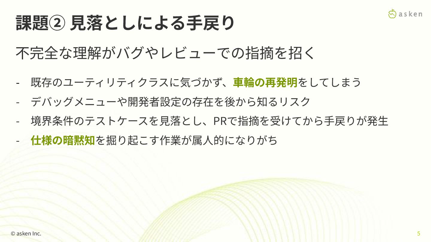 課題② ⾒落としによる⼿戻り 不完全な理解がバグやレビューでの指摘を招く - 既存のユーティリティクラスに気づかず、⾞輪の再発明をしてしまう - デバッグメニューや開発者設定の存在を後から知るリスク - 境界条件のテストケースを⾒落とし、PRで指摘を受けてから⼿戻りが発⽣ -