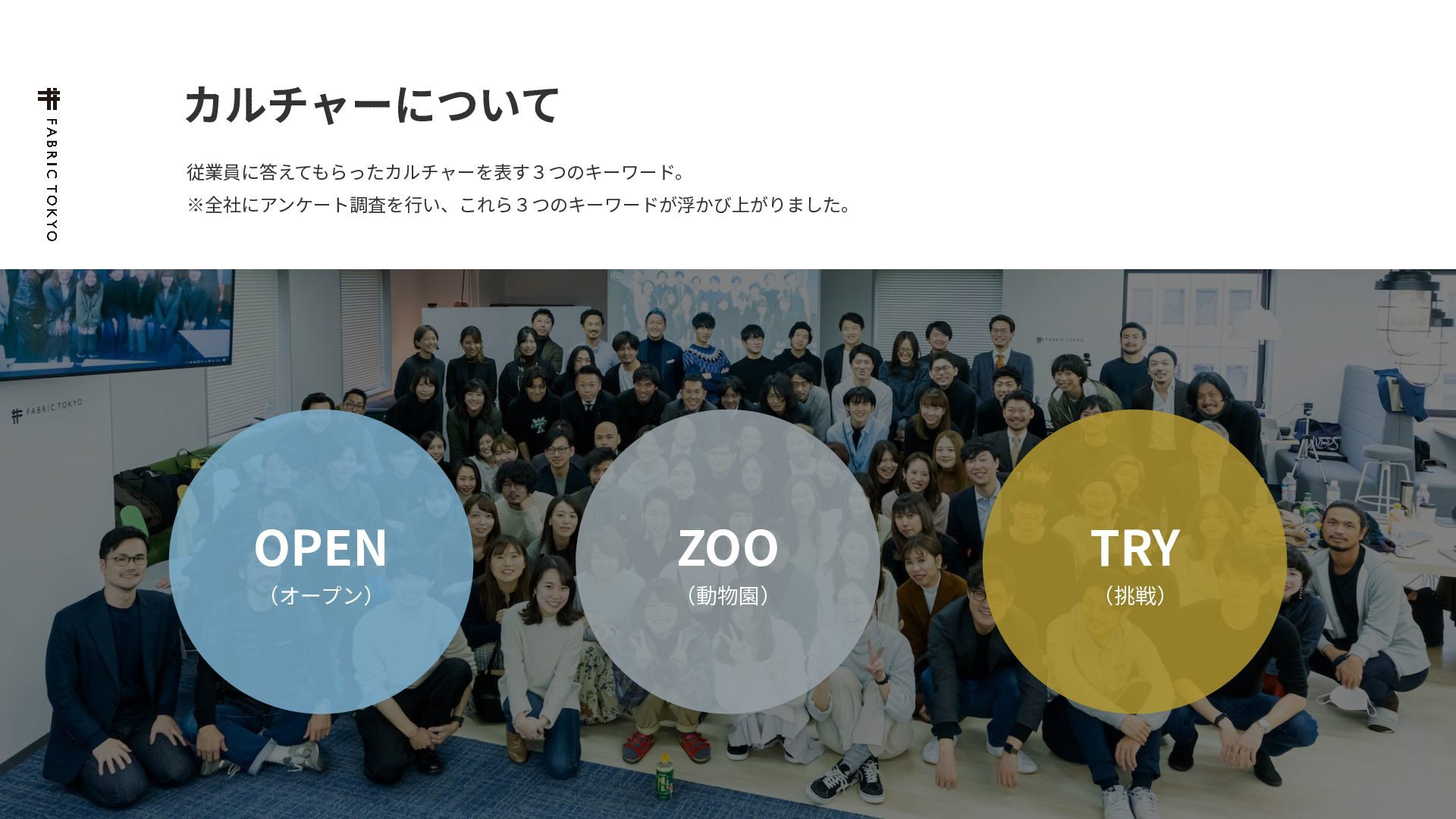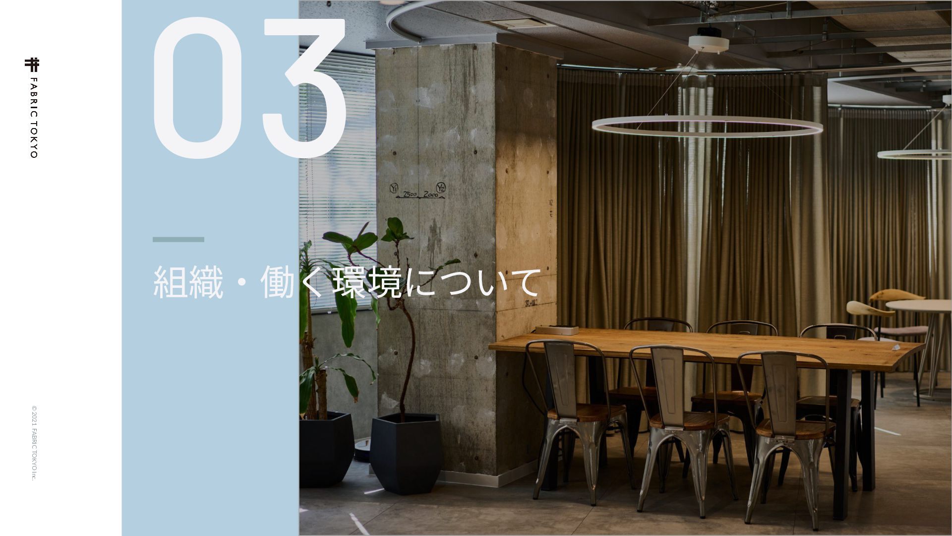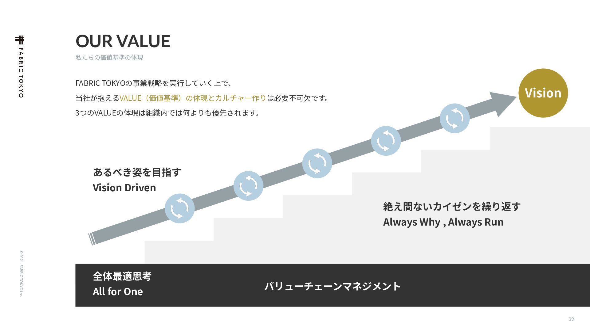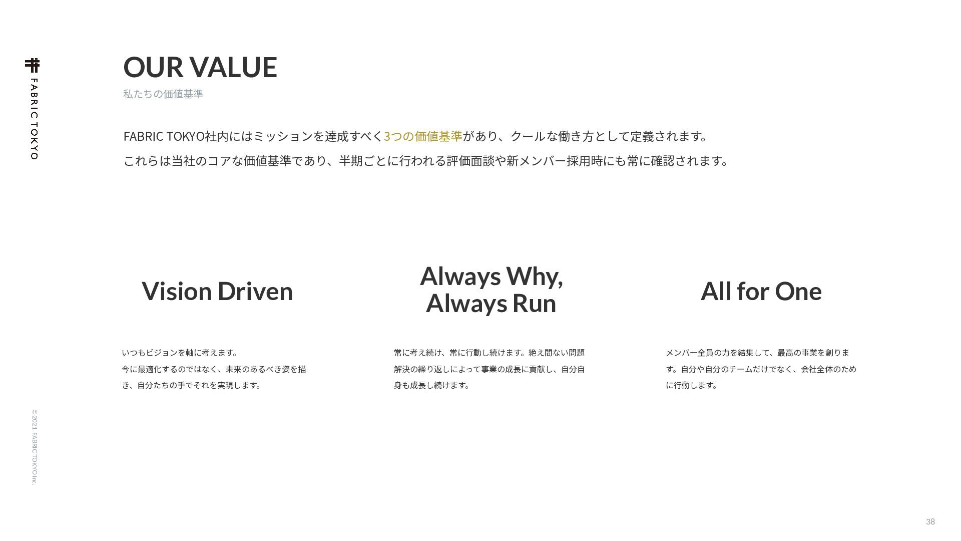 TOKYO社内にはミッションを達成すべく3つの価値基準があり、クールな働き⽅として定義されます。 これらは当社のコアな価値基準であり、半期ごとに⾏われる評価⾯談や新メンバー採⽤時にも常に確認されます。 Vision Driven Always Why, Always Run All for One いつもビジョンを軸に考えます。 今に最適化するのではなく、未来のあるべき姿を描 き、⾃分たちの⼿でそれを実現します。 常に考え続け、常に⾏動し続けます。絶え間ない問題 解決の繰り返しによって事業の成⻑に貢献し、⾃分⾃ ⾝も成⻑し続けます。 メンバー全員の⼒を結集して、最⾼の事業を創りま す。⾃分や⾃分のチームだけでなく、会社全体のため に⾏動します。