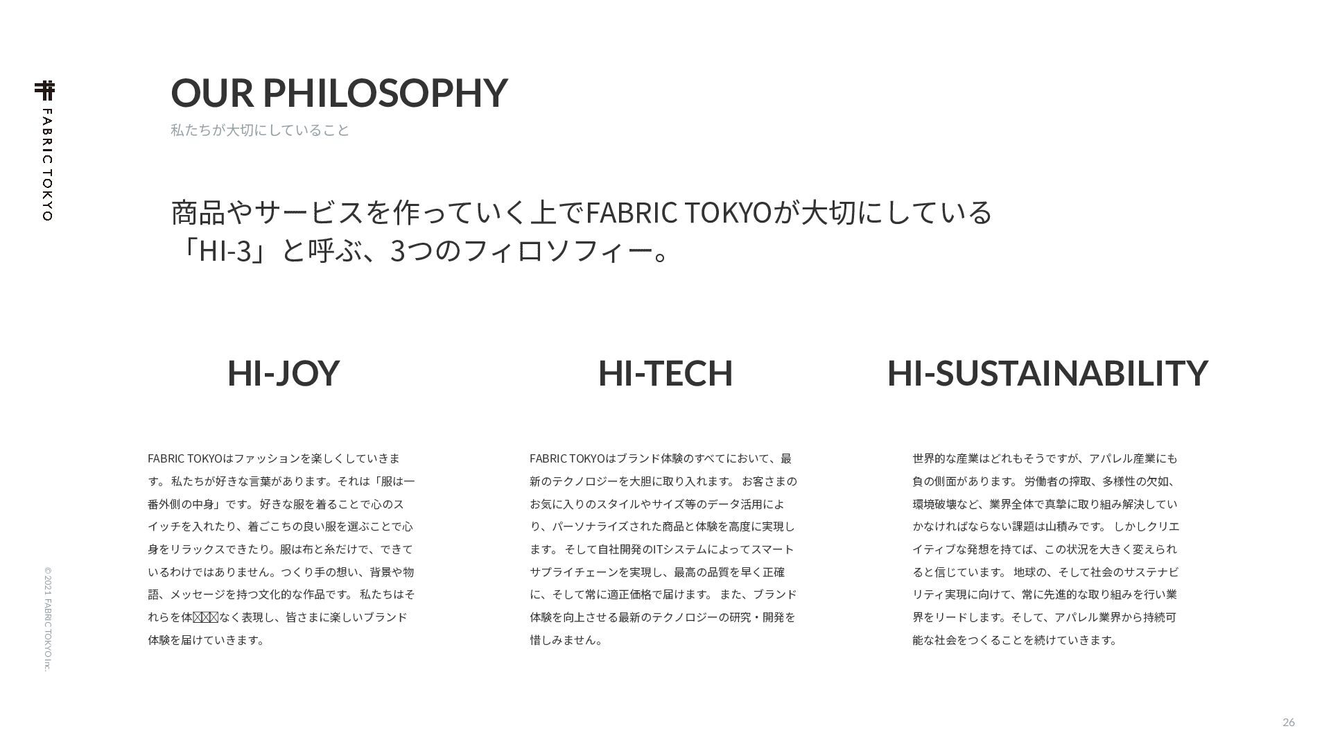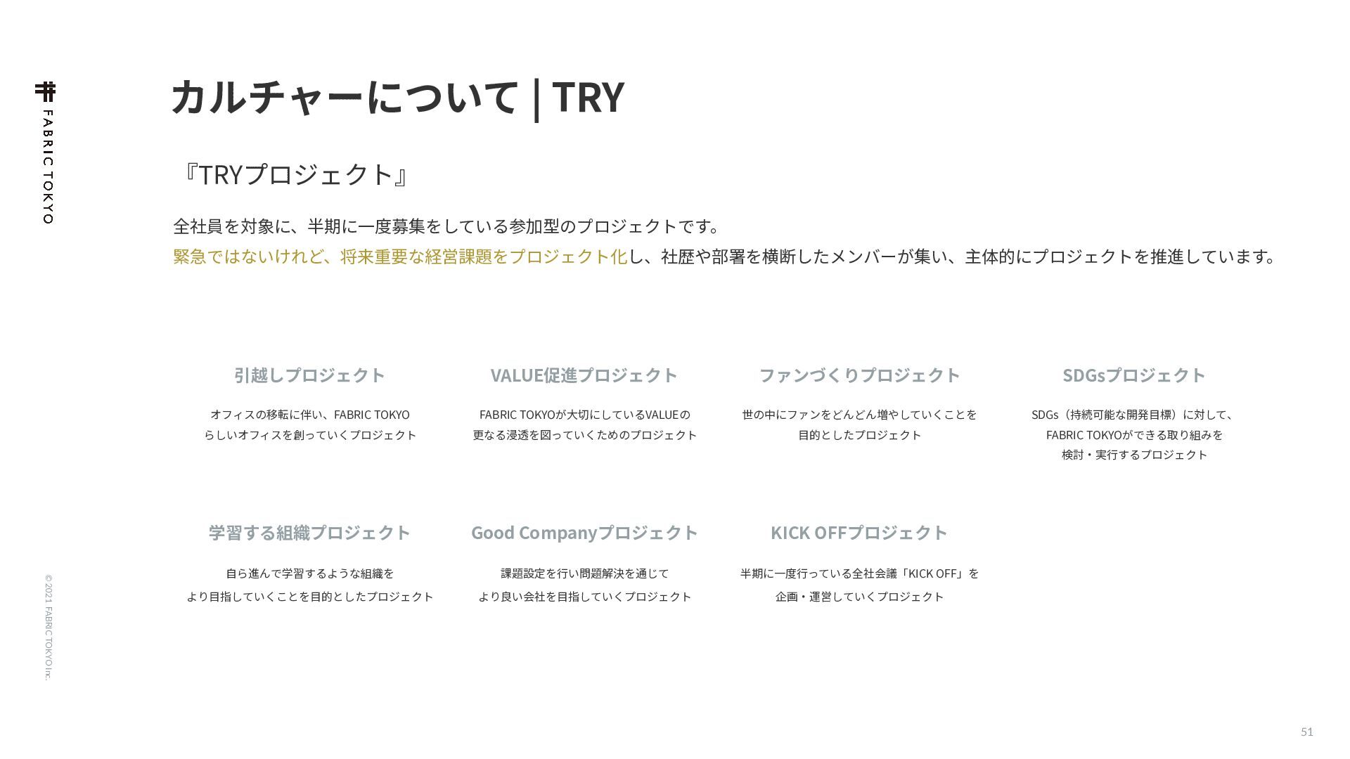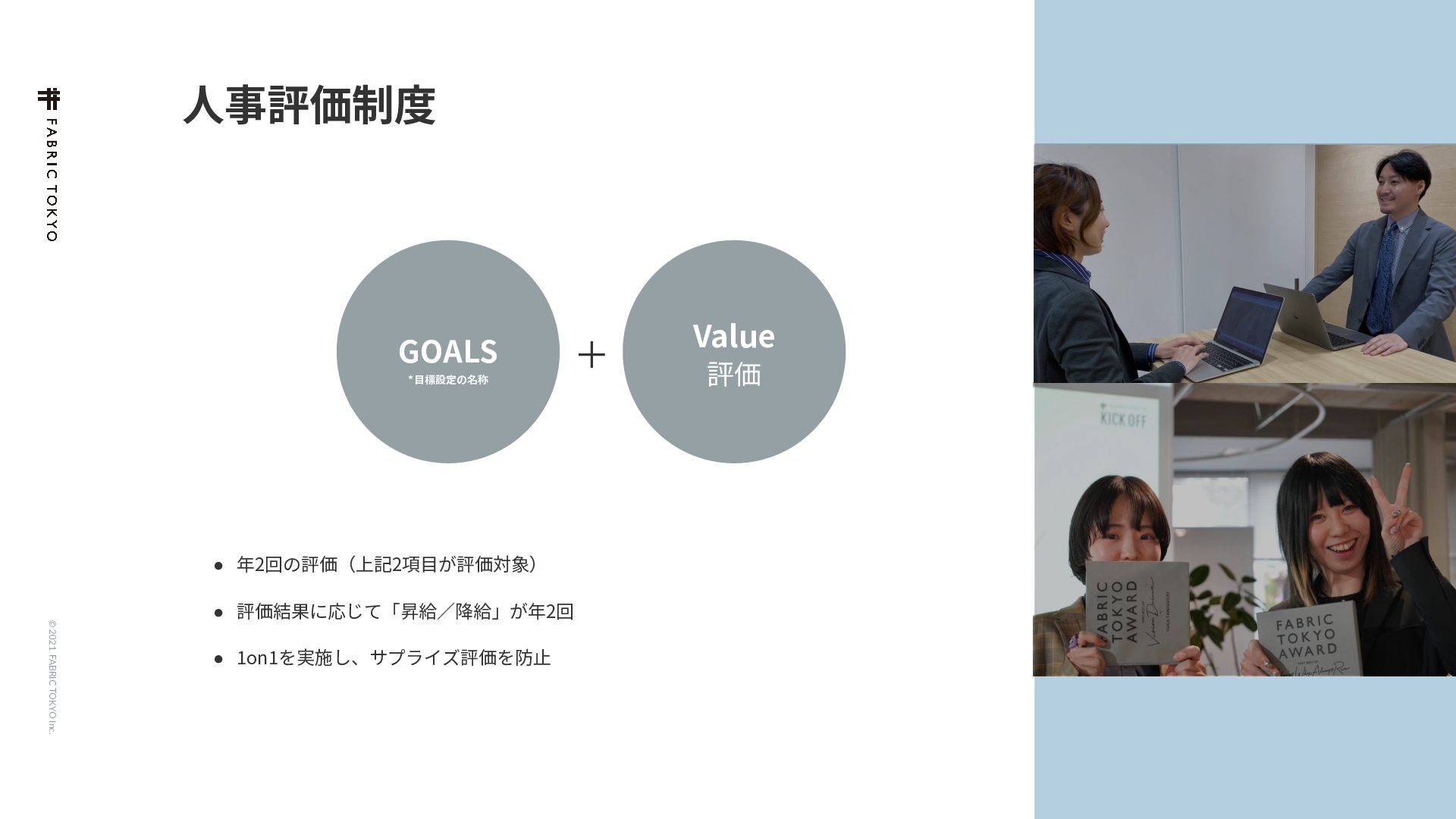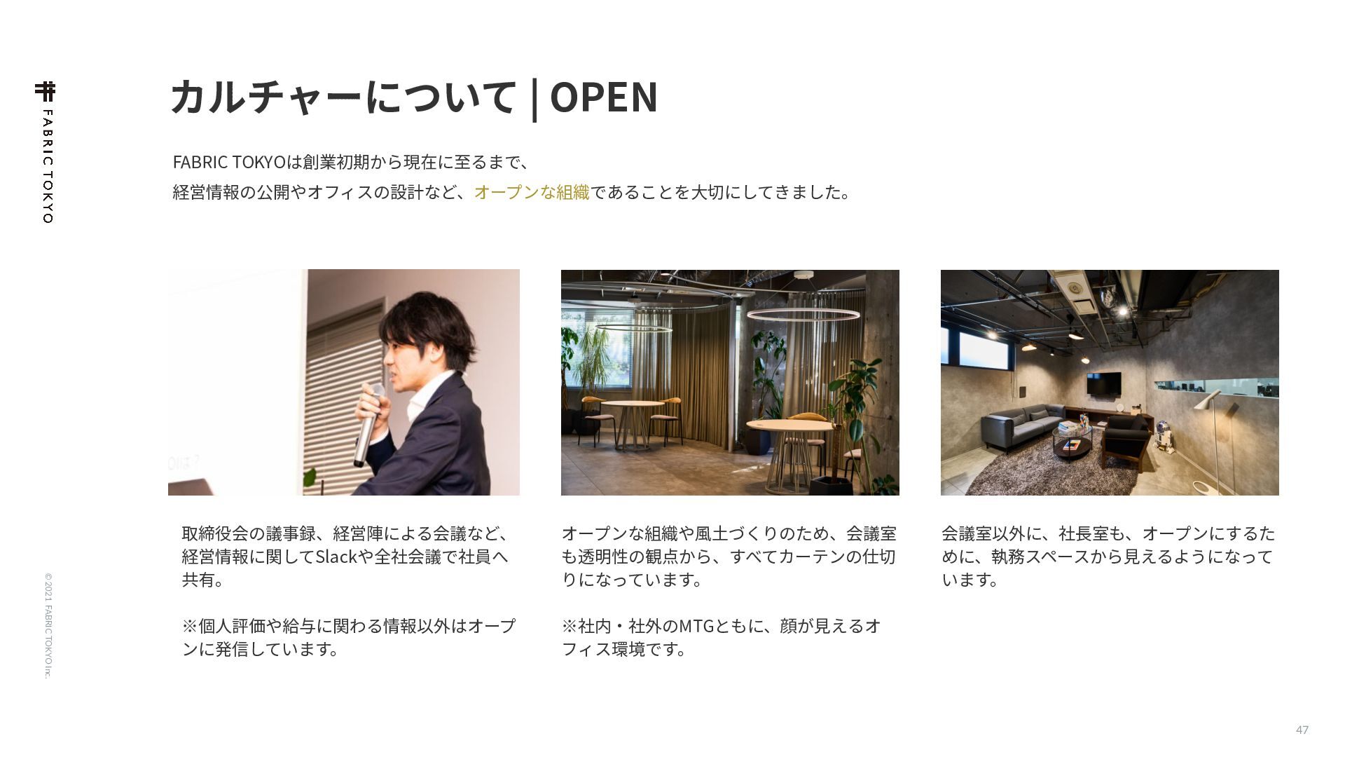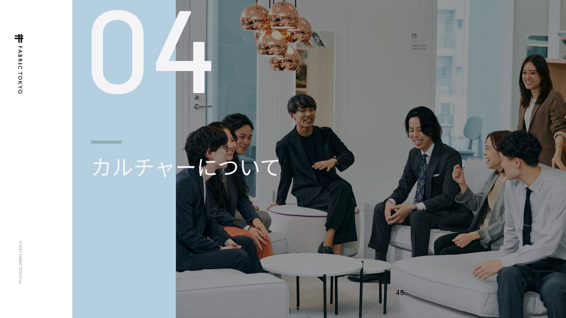 TOKYO社内にはミッションを達成すべく3つの価値基準があり、クールな働き⽅として定義されます。 これらは当社のコアな価値基準であり、半期ごとに⾏われる評価⾯談や新メンバー採⽤時にも常に確認されます。 Vision Driven Always Why, Always Run All for One いつもビジョンを軸に考えます。 今に最適化するのではなく、未来のあるべき姿を描 き、⾃分たちの⼿でそれを実現します。 常に考え続け、常に⾏動し続けます。絶え間ない問題 解決の繰り返しによって事業の成⻑に貢献し、⾃分⾃ ⾝も成⻑し続けます。 メンバー全員の⼒を結集して、最⾼の事業を創りま す。⾃分や⾃分のチームだけでなく、会社全体のため に⾏動します。