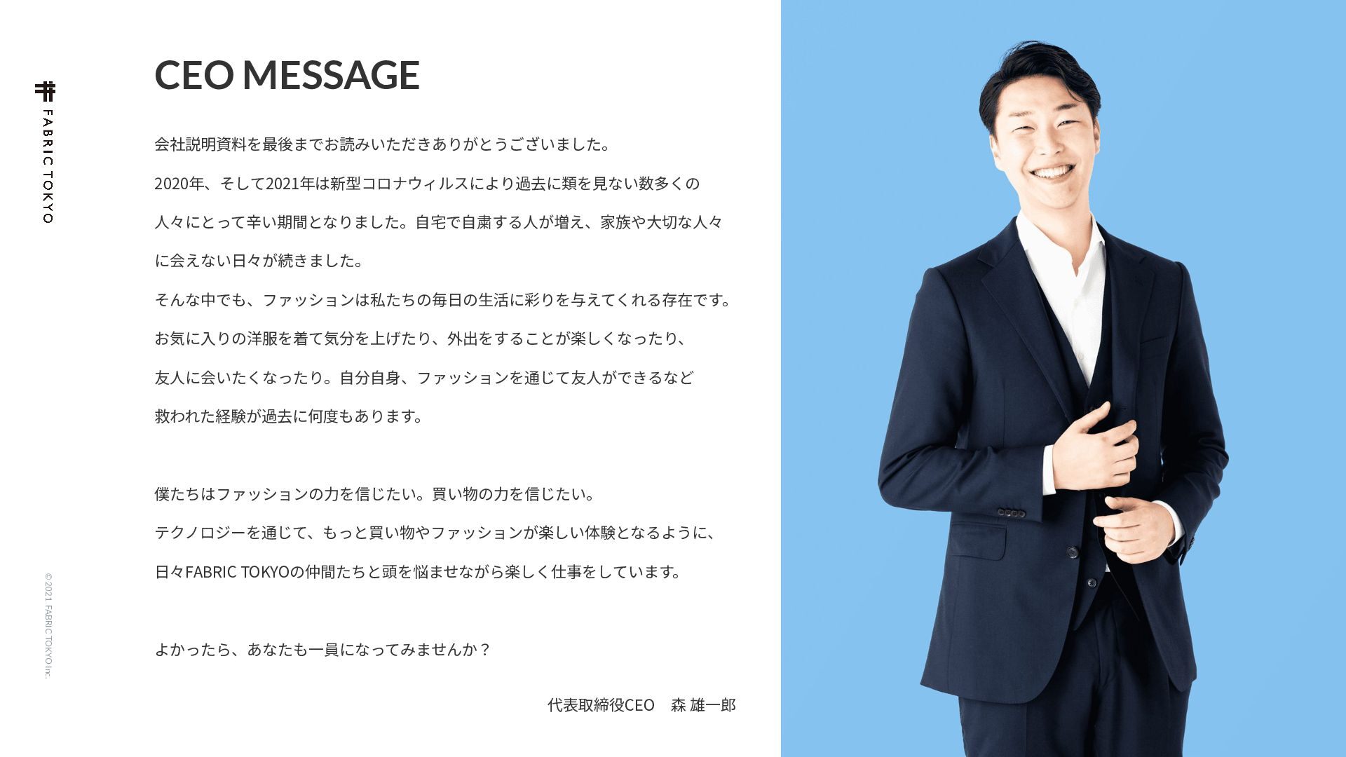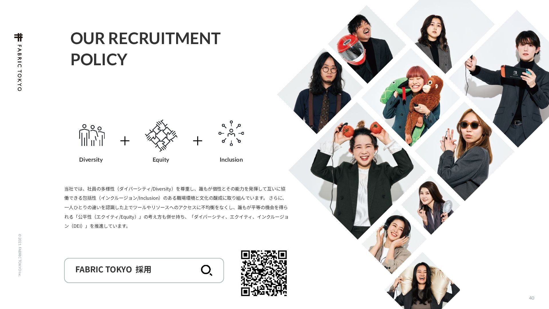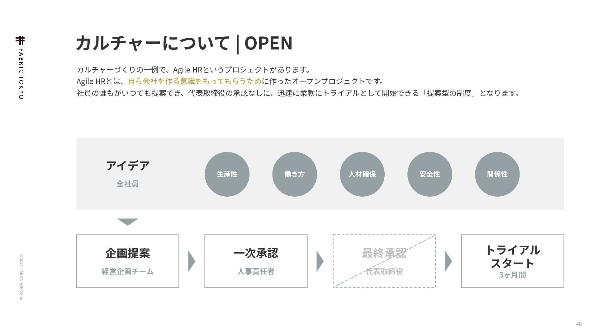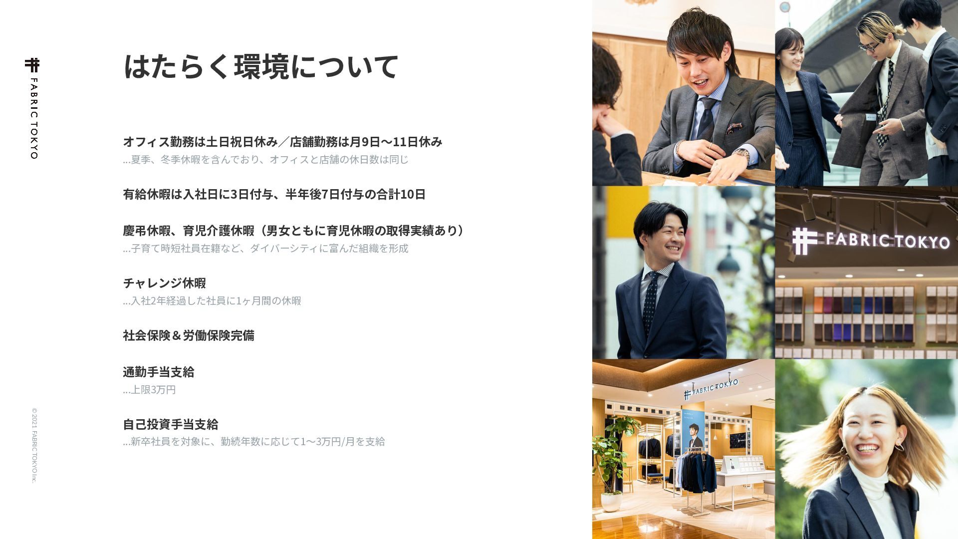 TOKYO社内にはミッションを達成すべく3つの価値基準があり、クールな働き⽅として定義されます。 これらは当社のコアな価値基準であり、半期ごとに⾏われる評価⾯談や新メンバー採⽤時にも常に確認されます。 Vision Driven Always Why, Always Run All for One いつもビジョンを軸に考えます。 今に最適化するのではなく、未来のあるべき姿を描 き、⾃分たちの⼿でそれを実現します。 常に考え続け、常に⾏動し続けます。絶え間ない問題 解決の繰り返しによって事業の成⻑に貢献し、⾃分⾃ ⾝も成⻑し続けます。 メンバー全員の⼒を結集して、最⾼の事業を創りま す。⾃分や⾃分のチームだけでなく、会社全体のため に⾏動します。