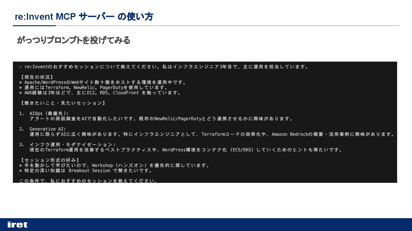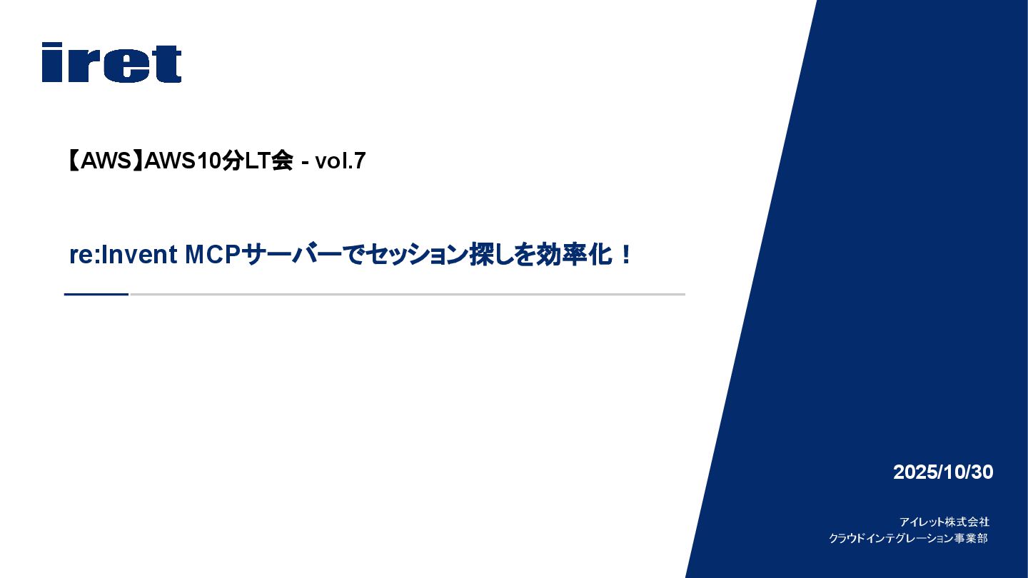 re:Invent MCPサーバーでセッション探しを効率化! 2025/10/30 アイレット株式会社 クラウドインテグレーション事業部 【AWS】AWS10分LT会 - vol.7