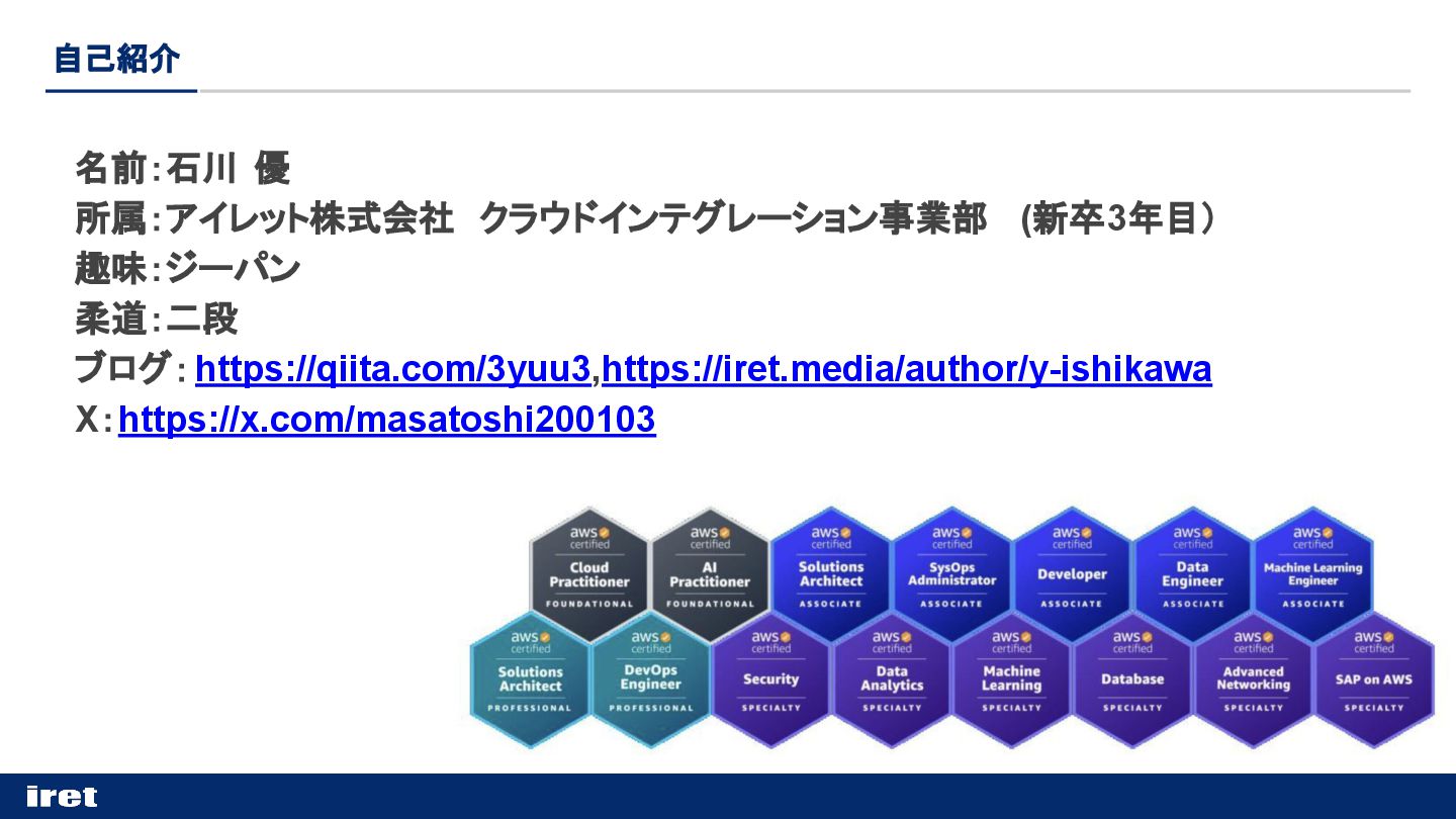 自己紹介 名前:石川 優 所属:アイレット株式会社 クラウドインテグレーション事業部 (新卒3年目) 趣味:ジーパン 柔道:二段 ブログ:https://qiita.com/3yuu3,https://iret.media/author/y-ishikawa X:https://x.com/masatoshi200103