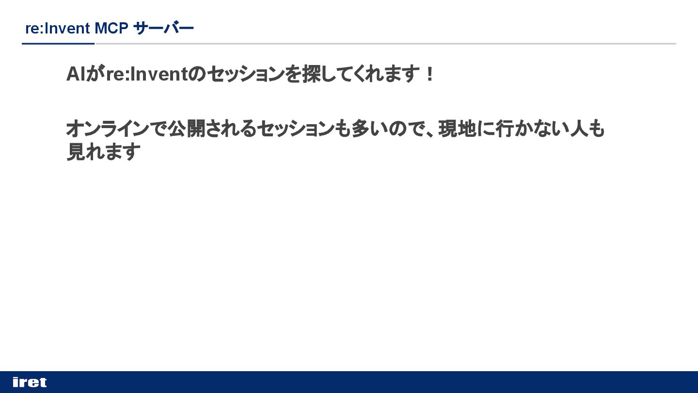 re:Invent MCP サーバー AIがre:Inventのセッションを探してくれます! オンラインで公開されるセッションも多いので、現地に行かない人も 見れます